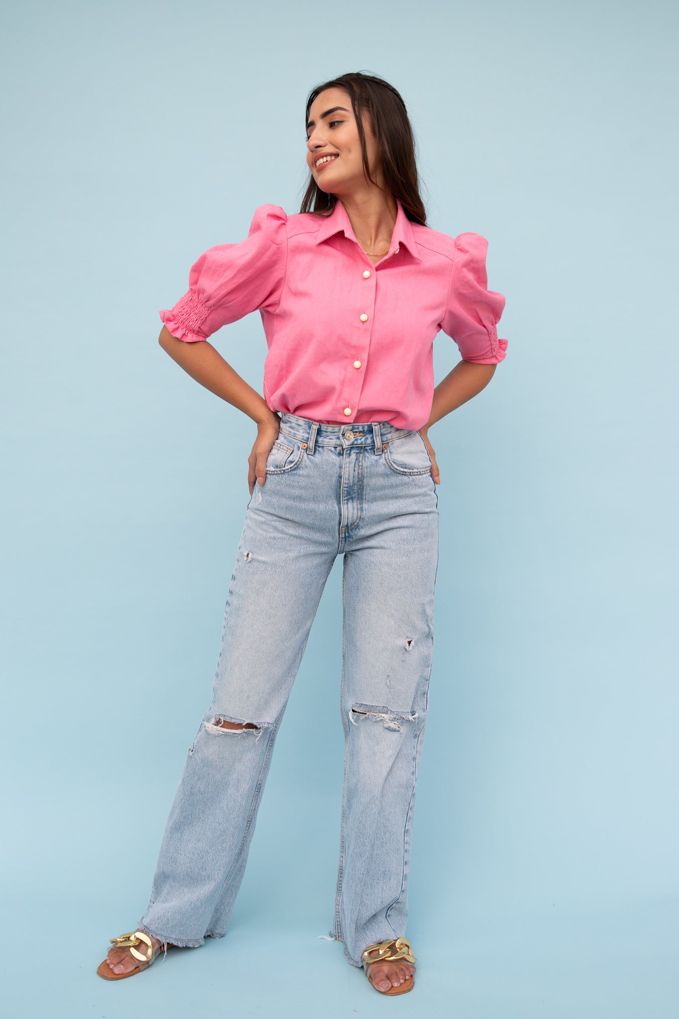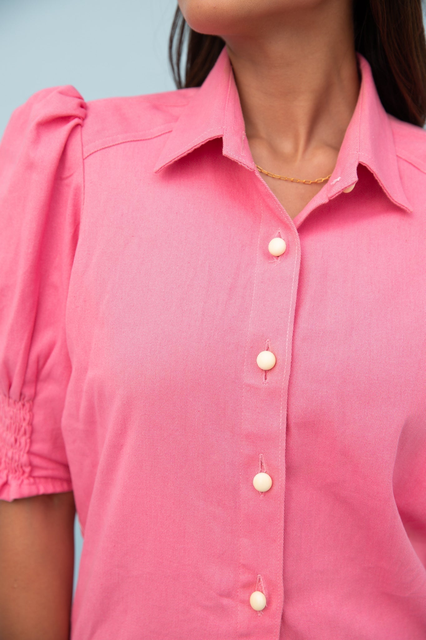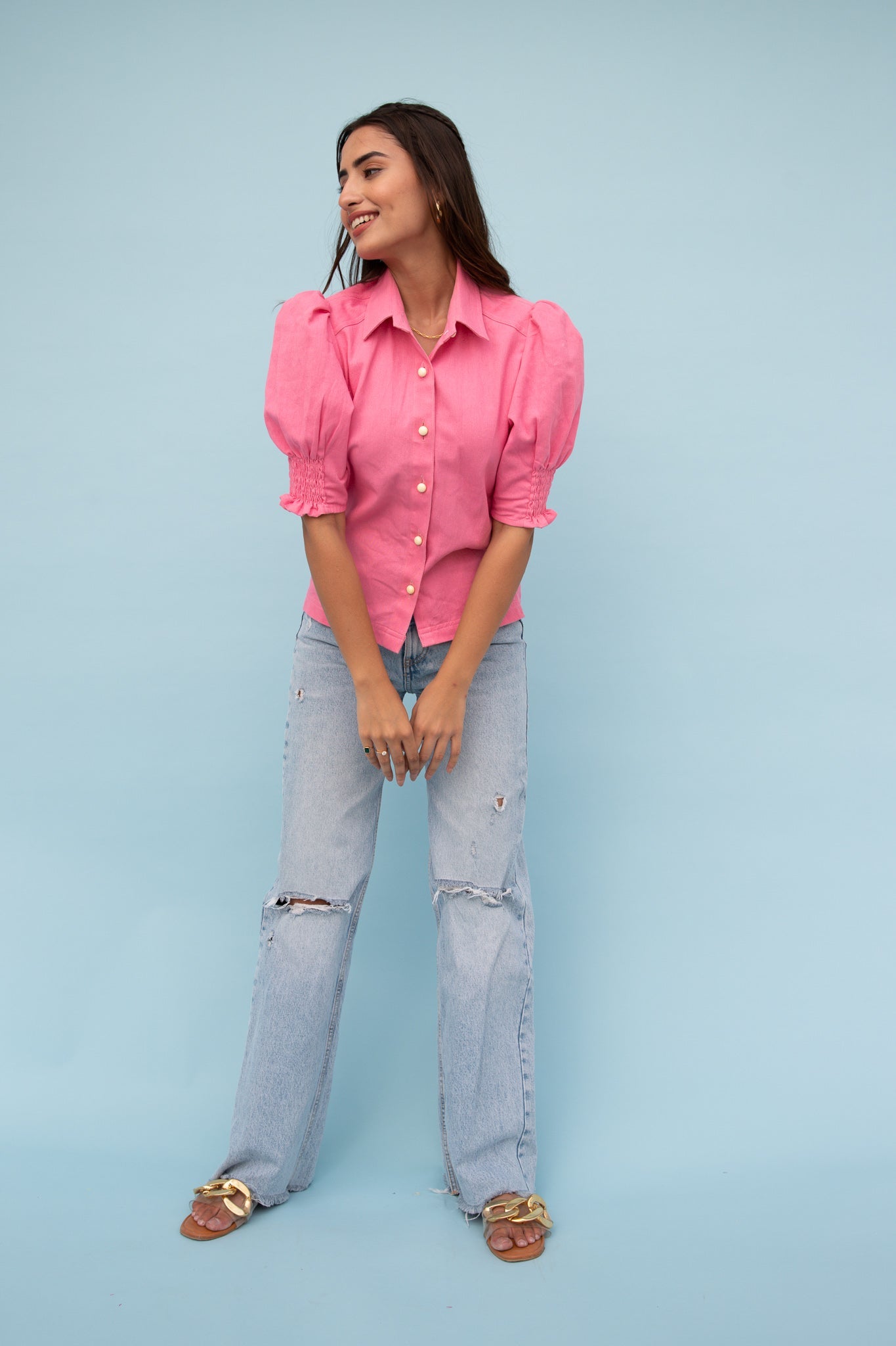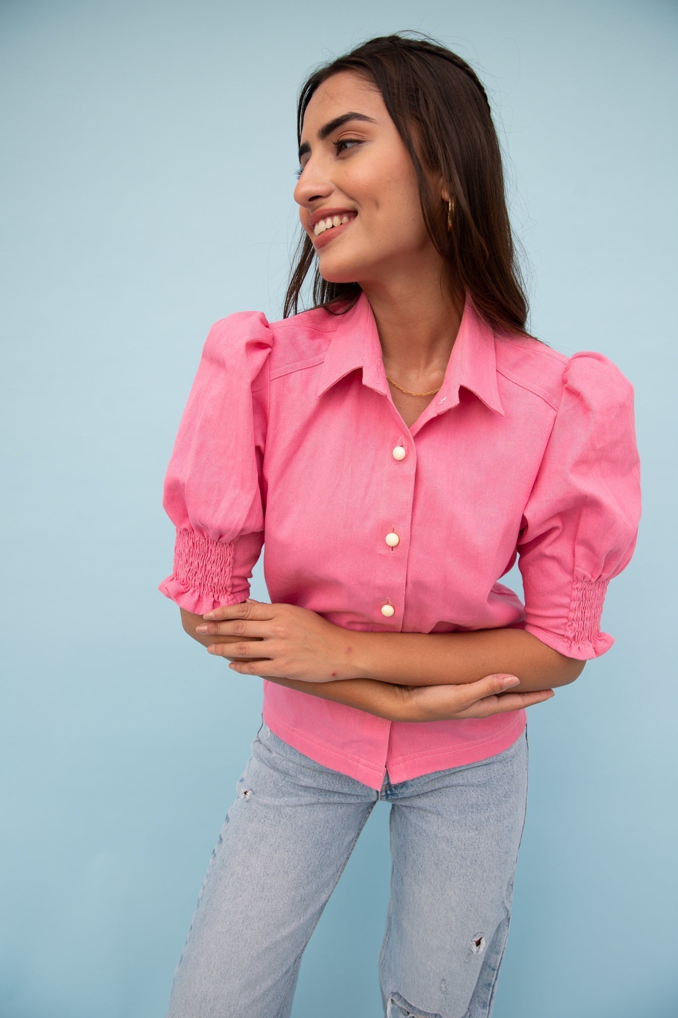 this jacket/top is AZO-free dyed in pink hue on denim fabric, featuring puff sleeves and a button-down style, and smocking detailing on the sleeves. It's a sure eye grabber.?ÿ