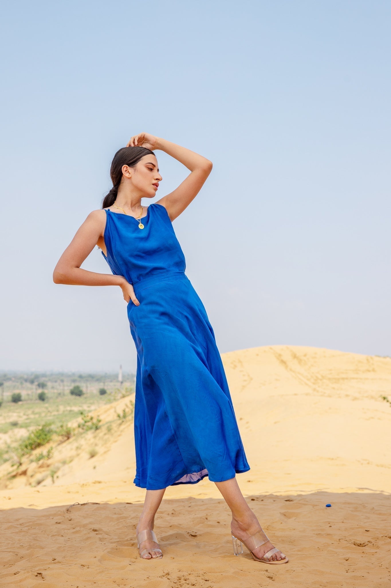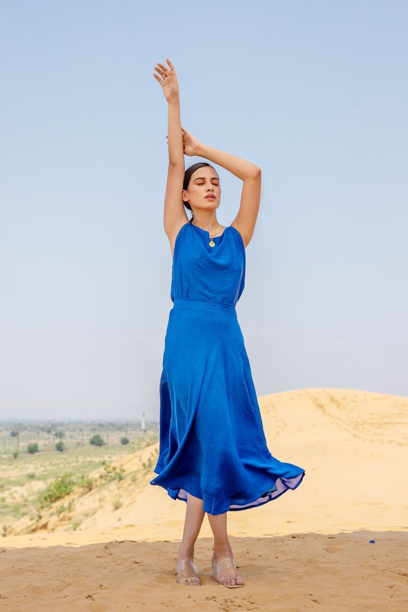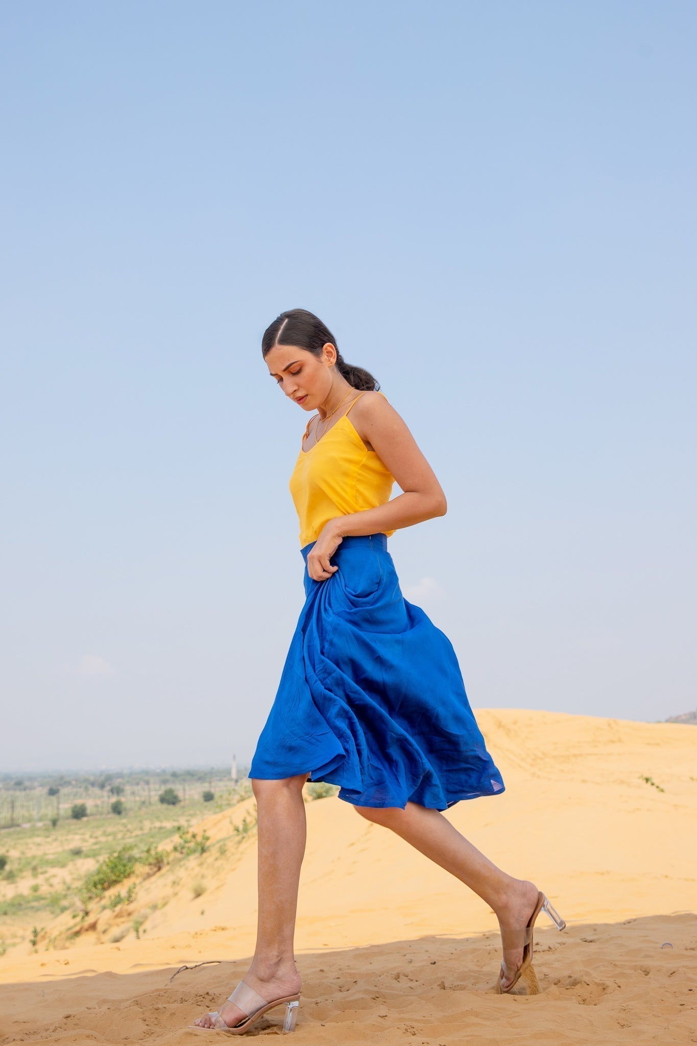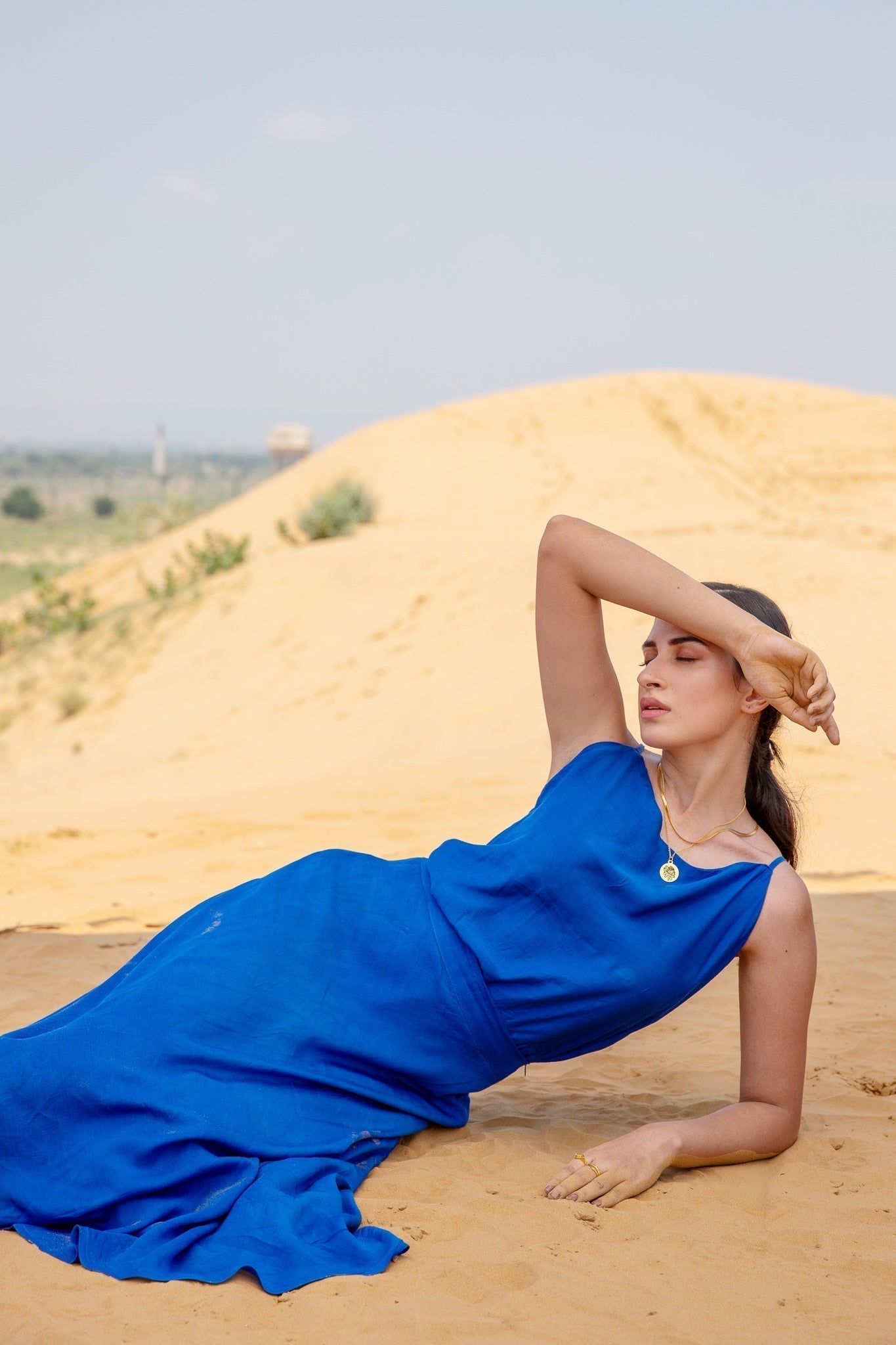 slim fit silk midaxi (midi+maxi) skirt dyed in blue with a lustrous fall and invisible zipper at the wearer's left.
