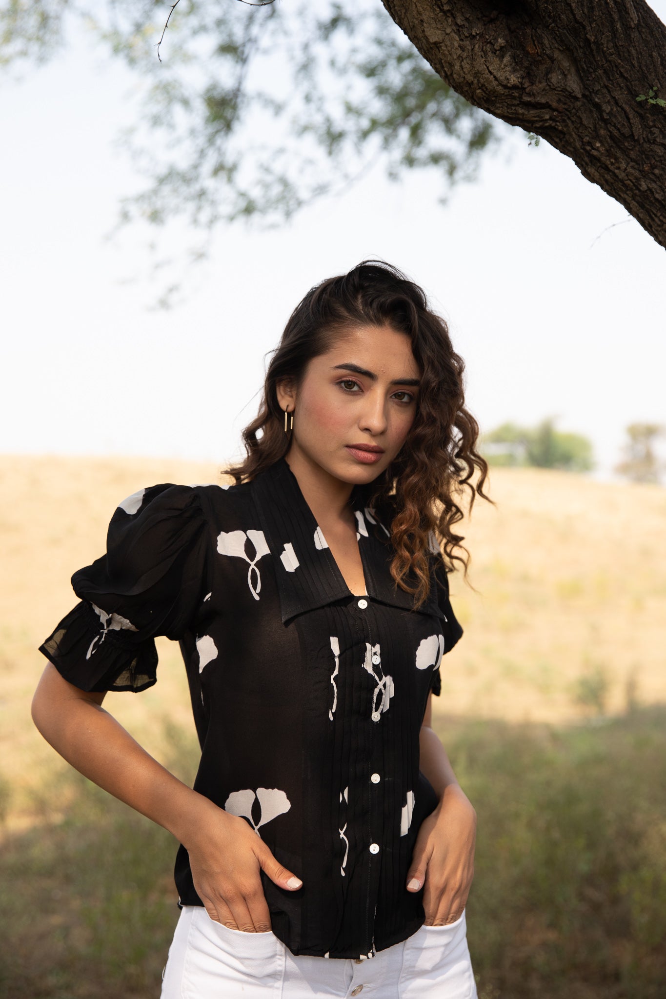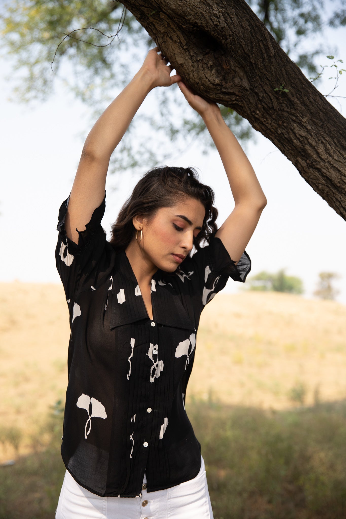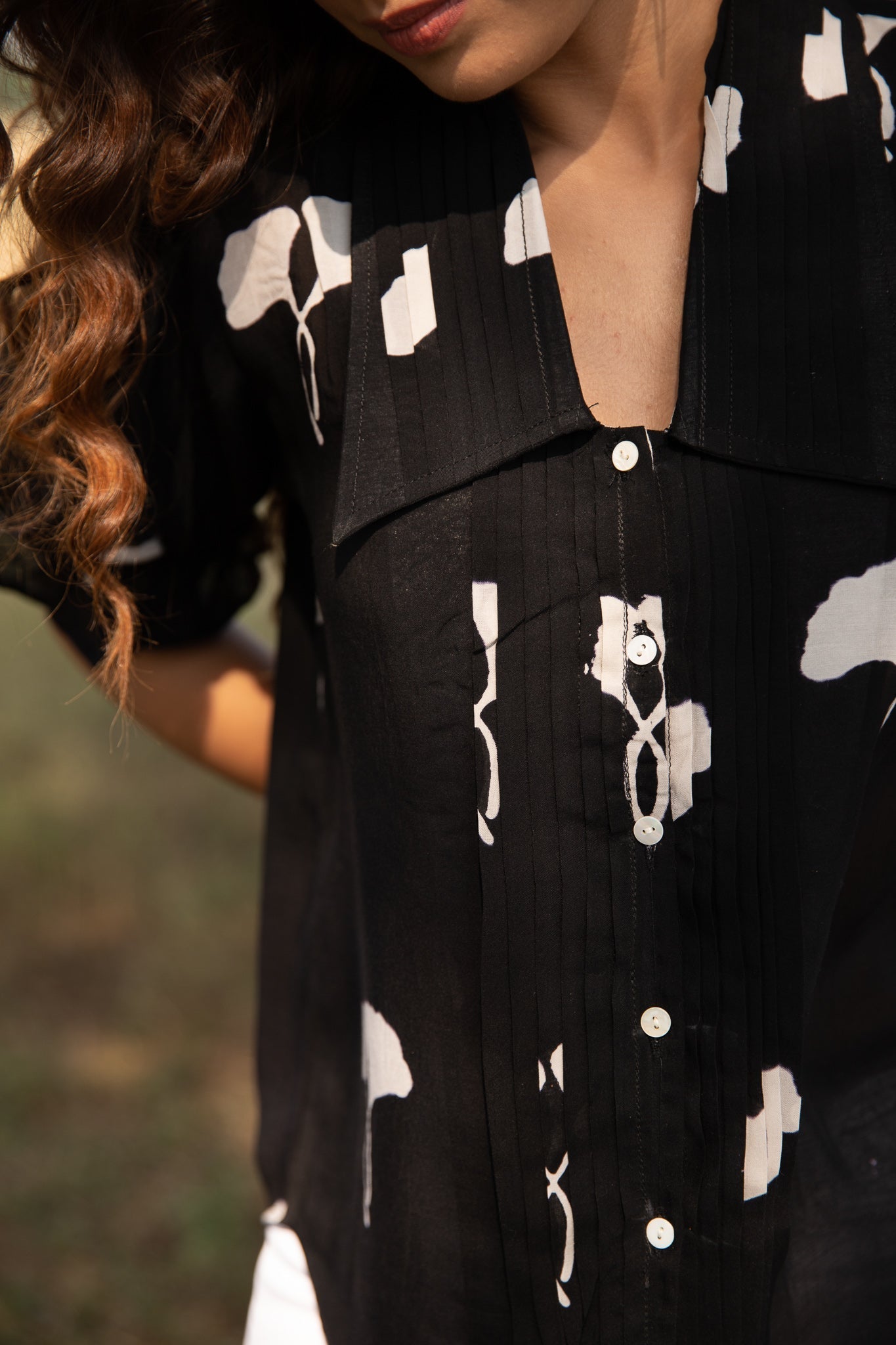 this shirt is crafted in muslin silk hand block printed in black featuring regular collar and pintucks detailing.?ÿ