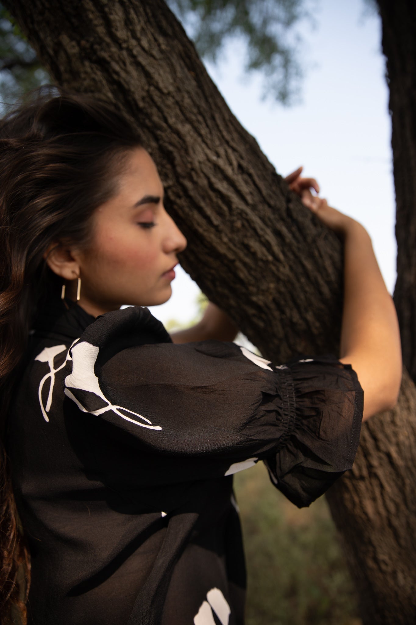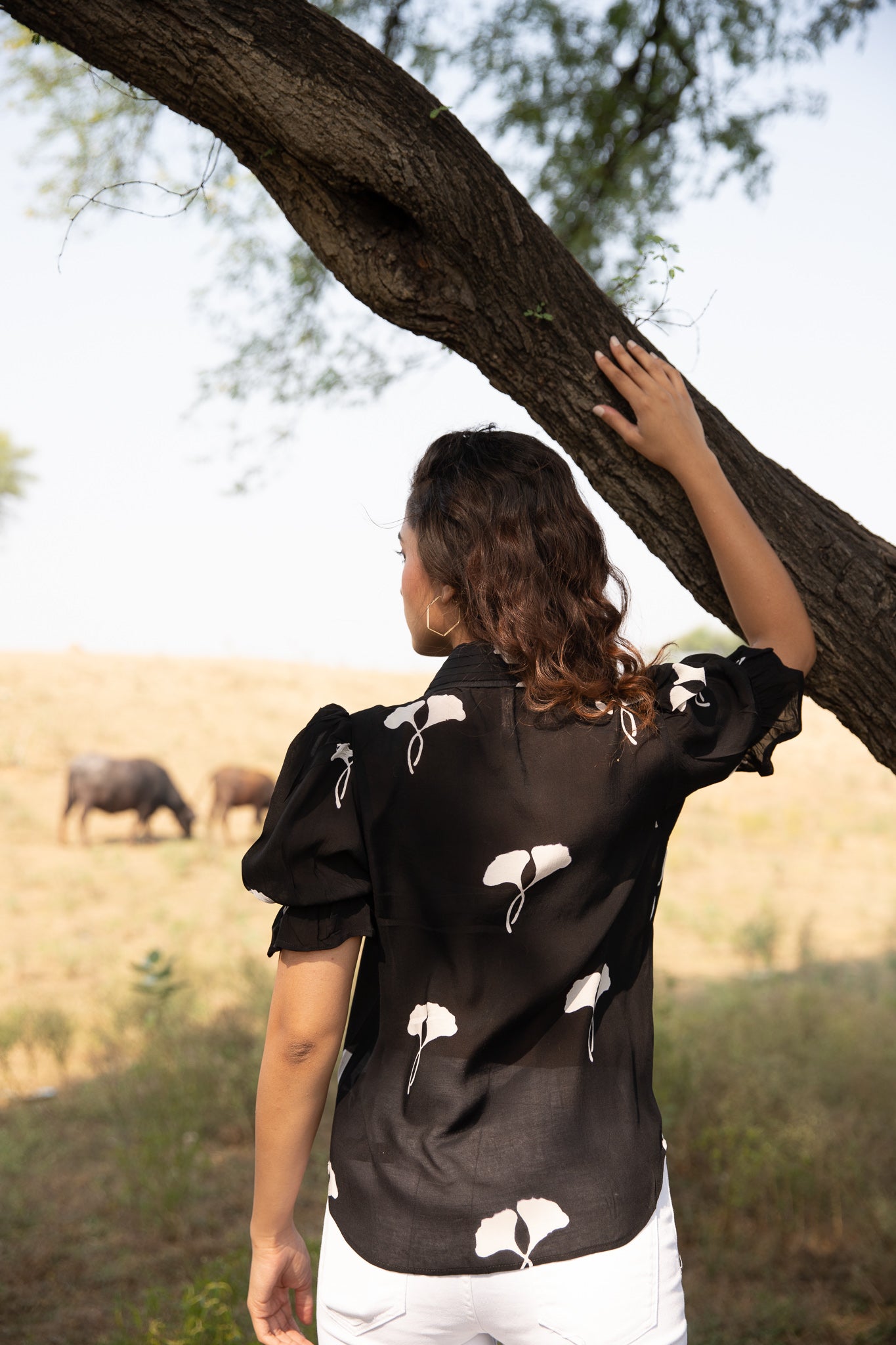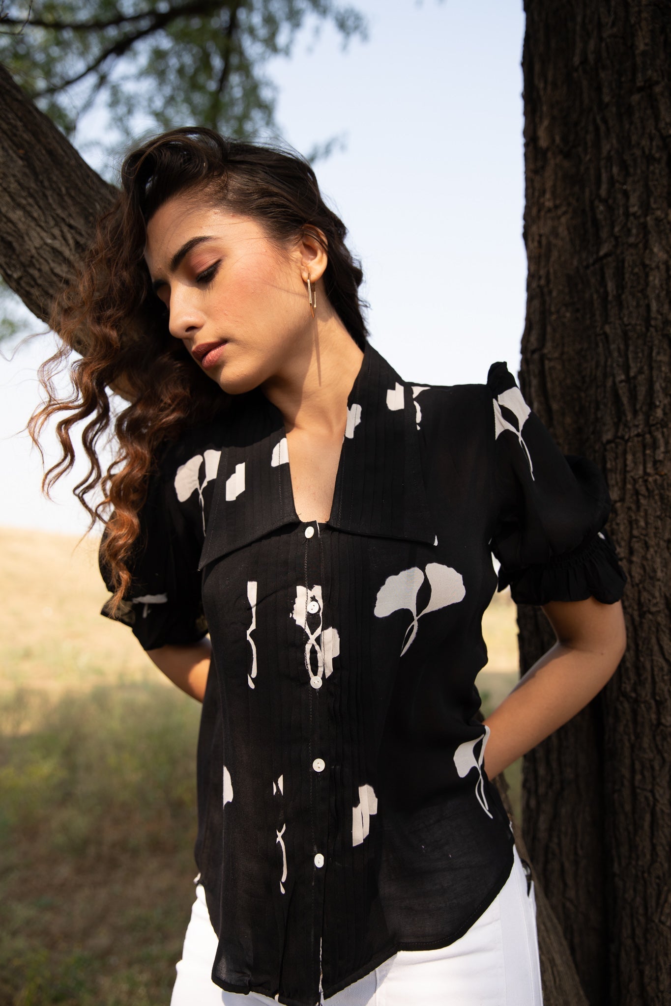 this shirt is crafted in muslin silk hand block printed in black featuring regular collar and pintucks detailing.?ÿ