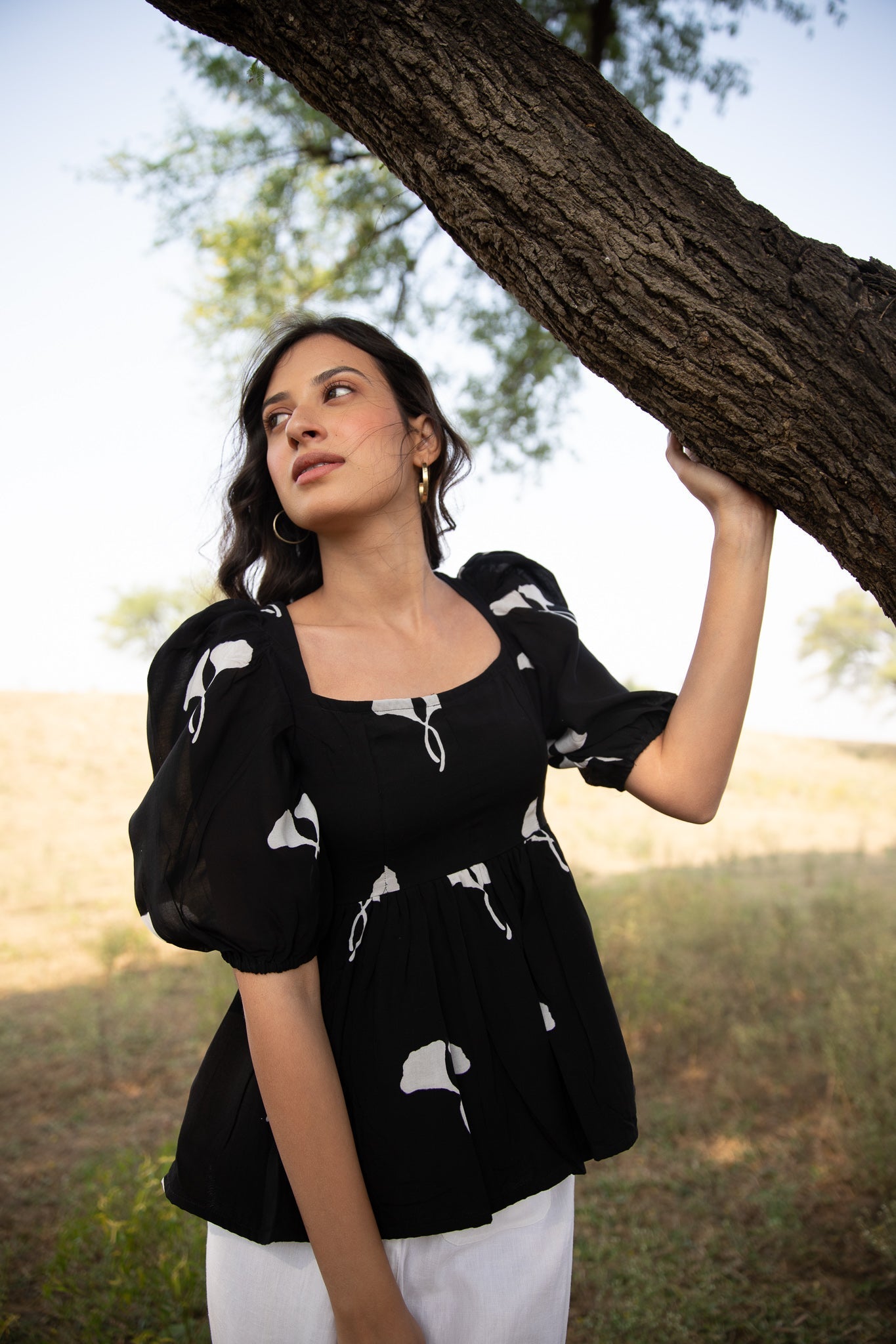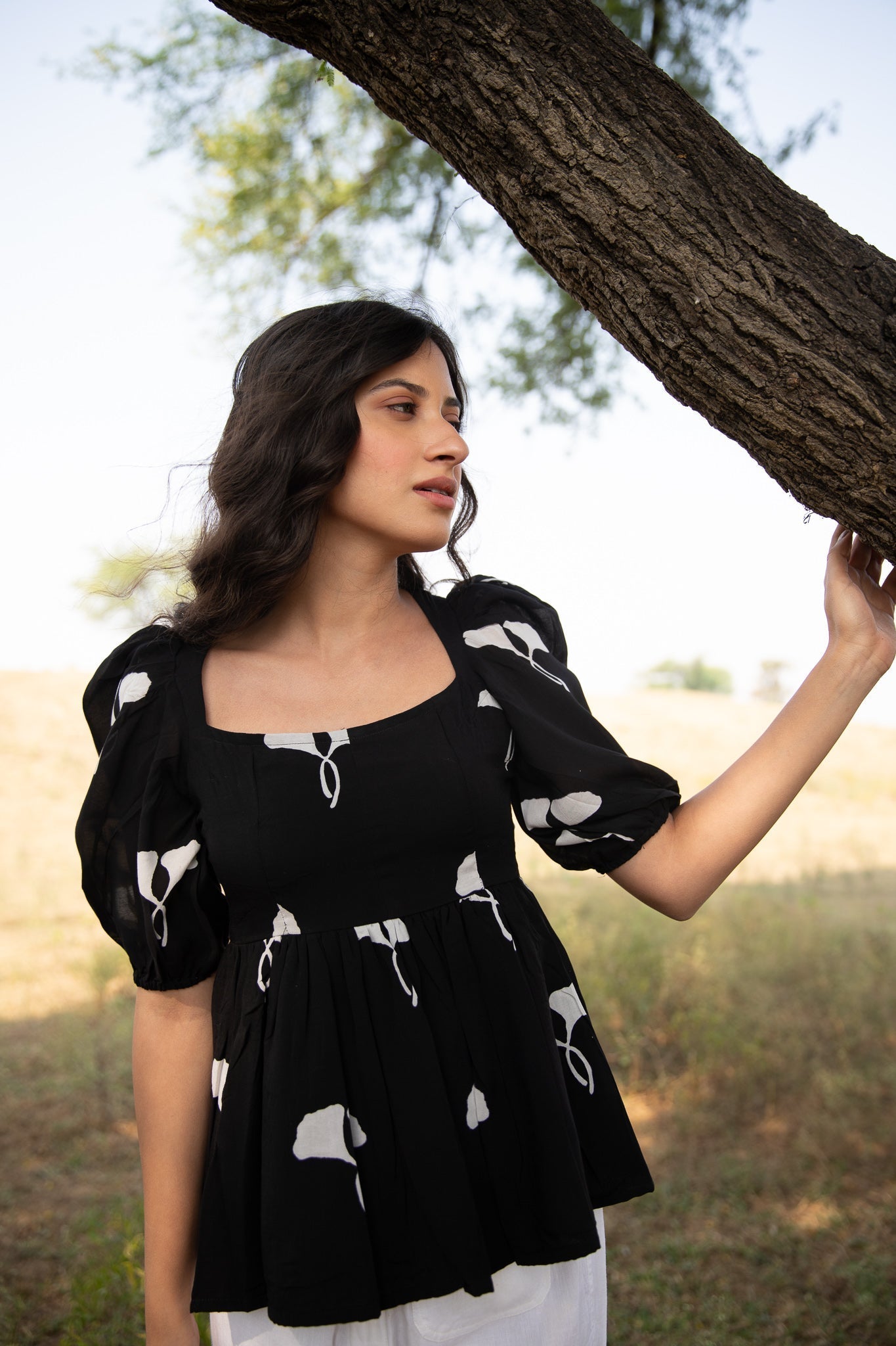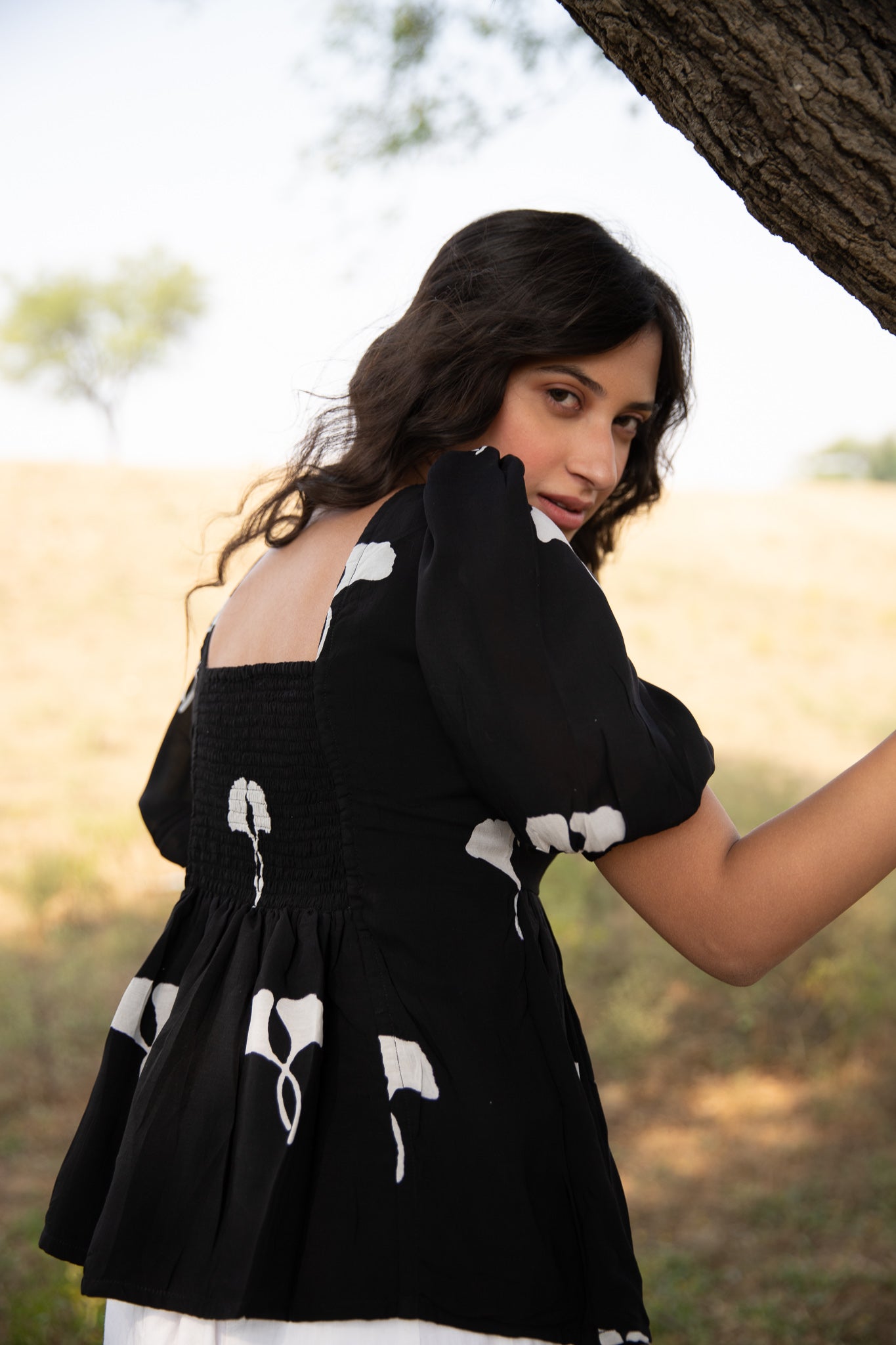 this fit and flare top is crafted in muslin silk and block printed in black in our exclusive print featuring horseshoe neckline, fit and flare bodice, and puffed sleeves.?ÿ
