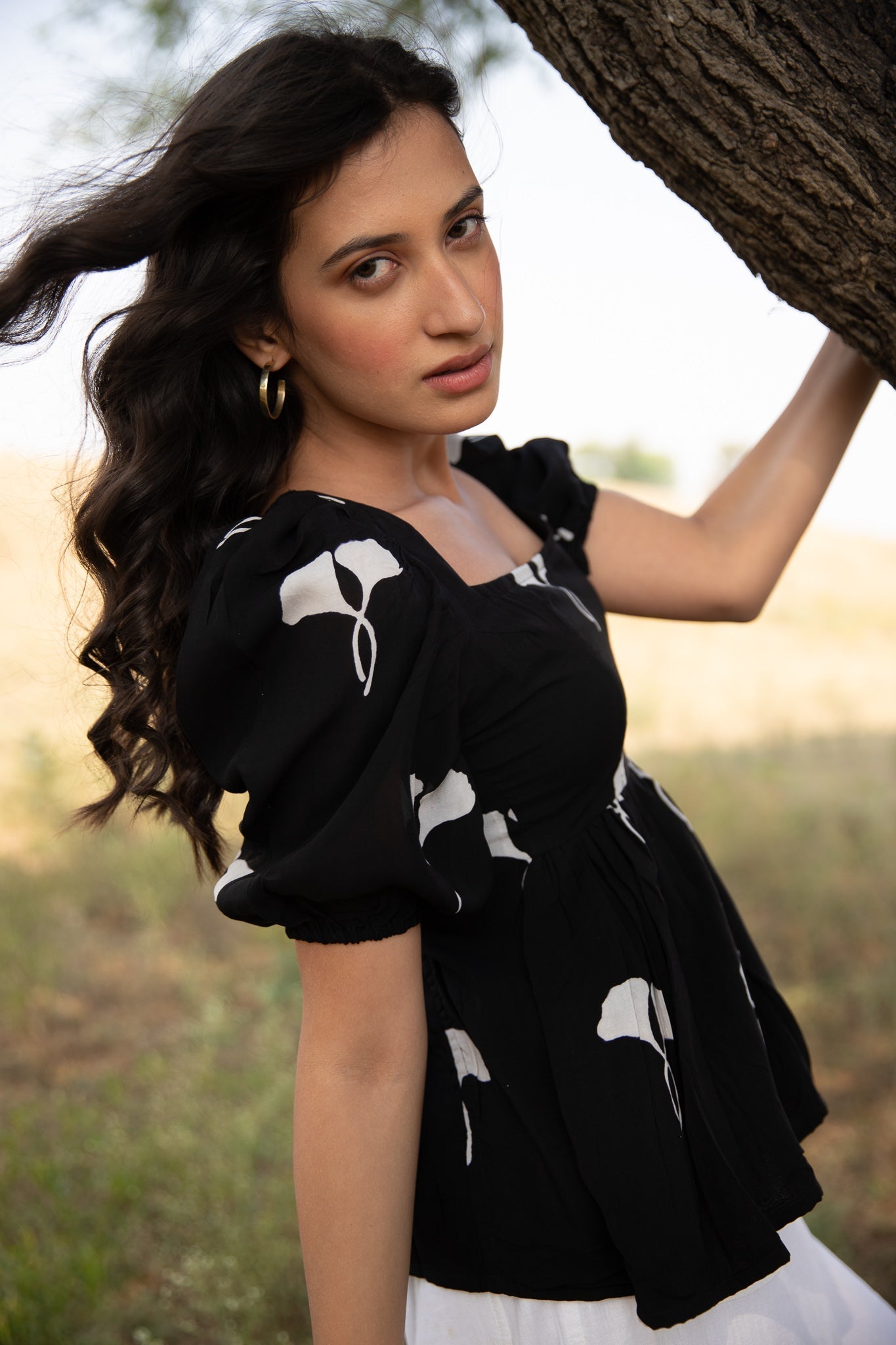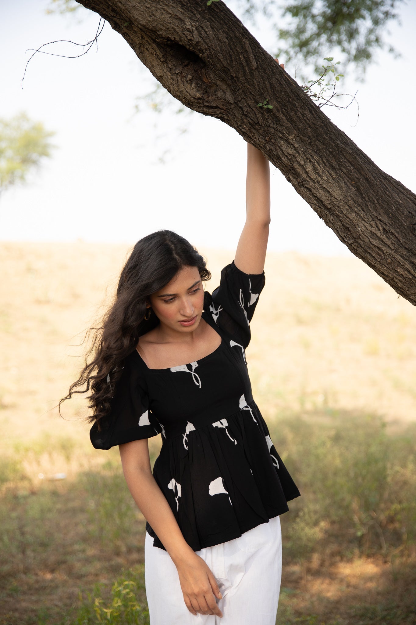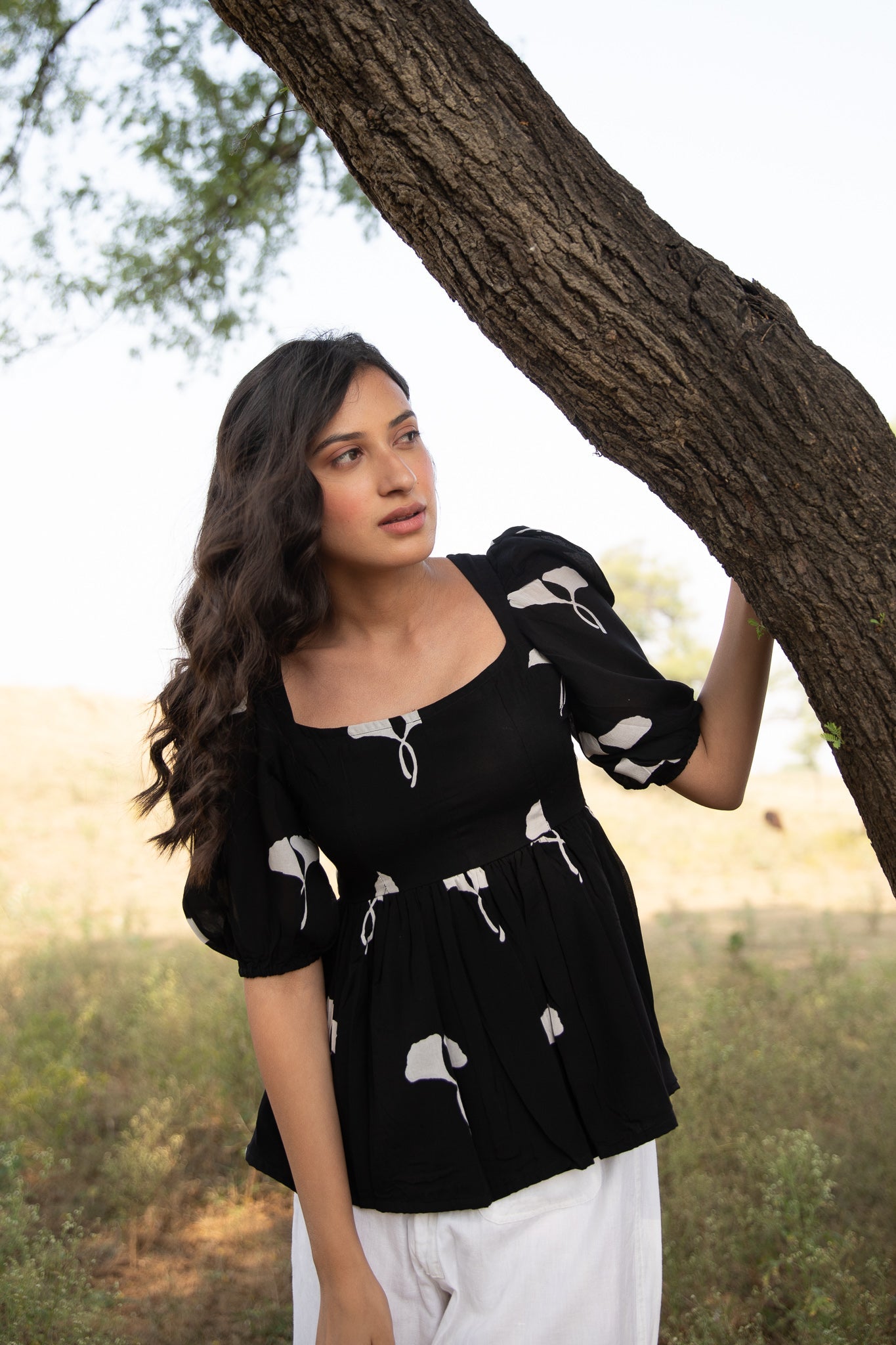 this fit and flare top is crafted in muslin silk and block printed in black in our exclusive print featuring horseshoe neckline, fit and flare bodice, and puffed sleeves.?ÿ