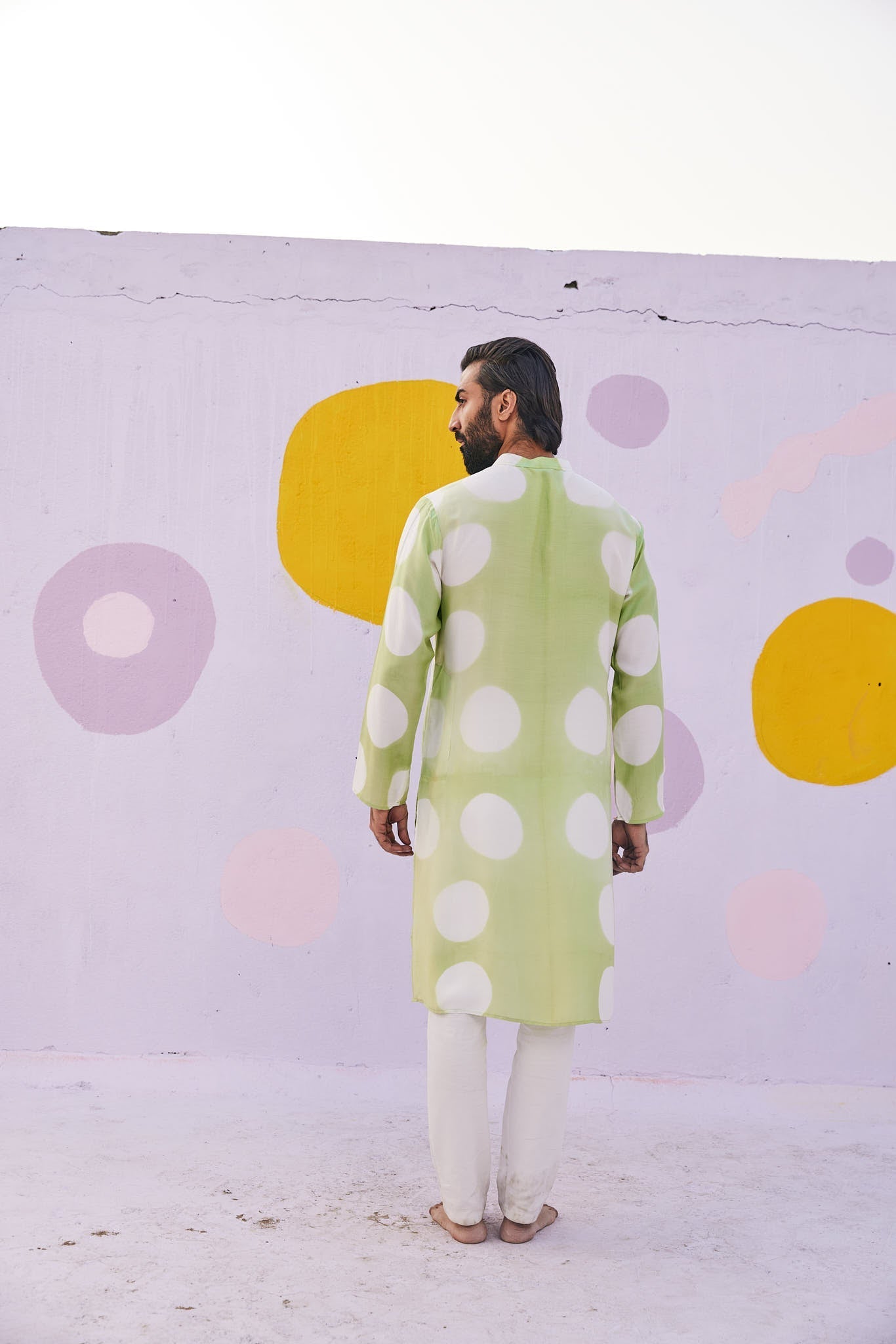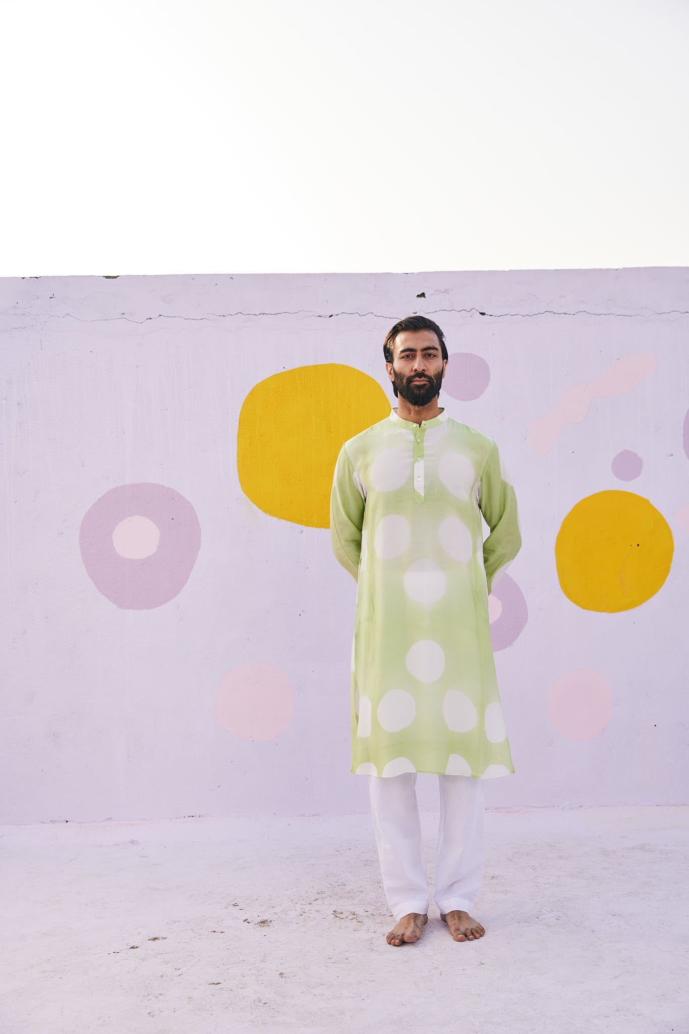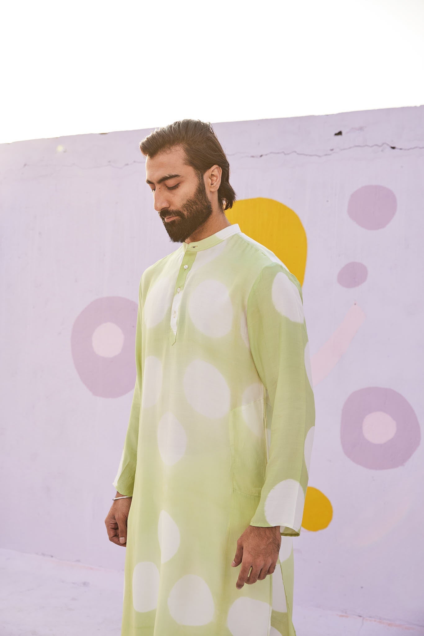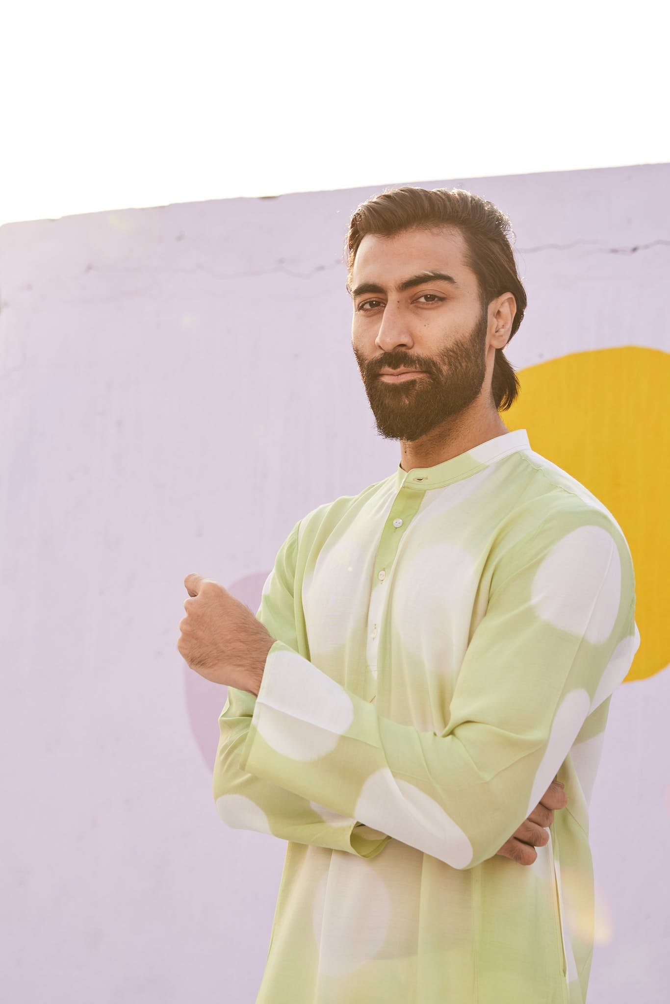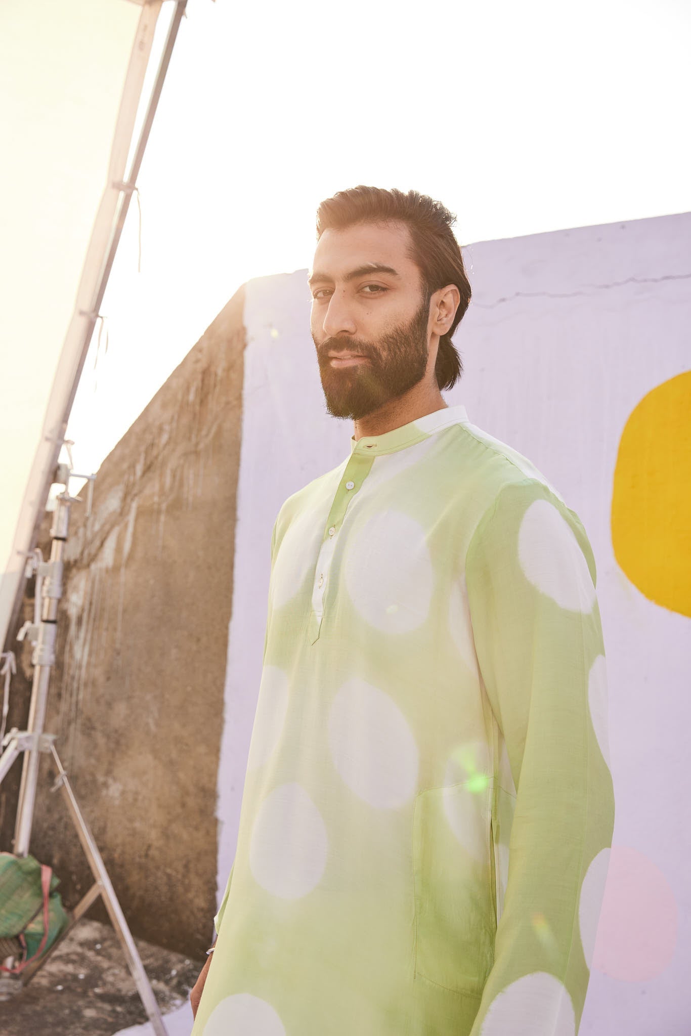 Make a dreamy statement in this perfect hue of green on muslin silk Dreamer Kurta! Steal the show with its stylish clamp dyed details and stand out at any wedding this season. Look sharp while keeping it cool!