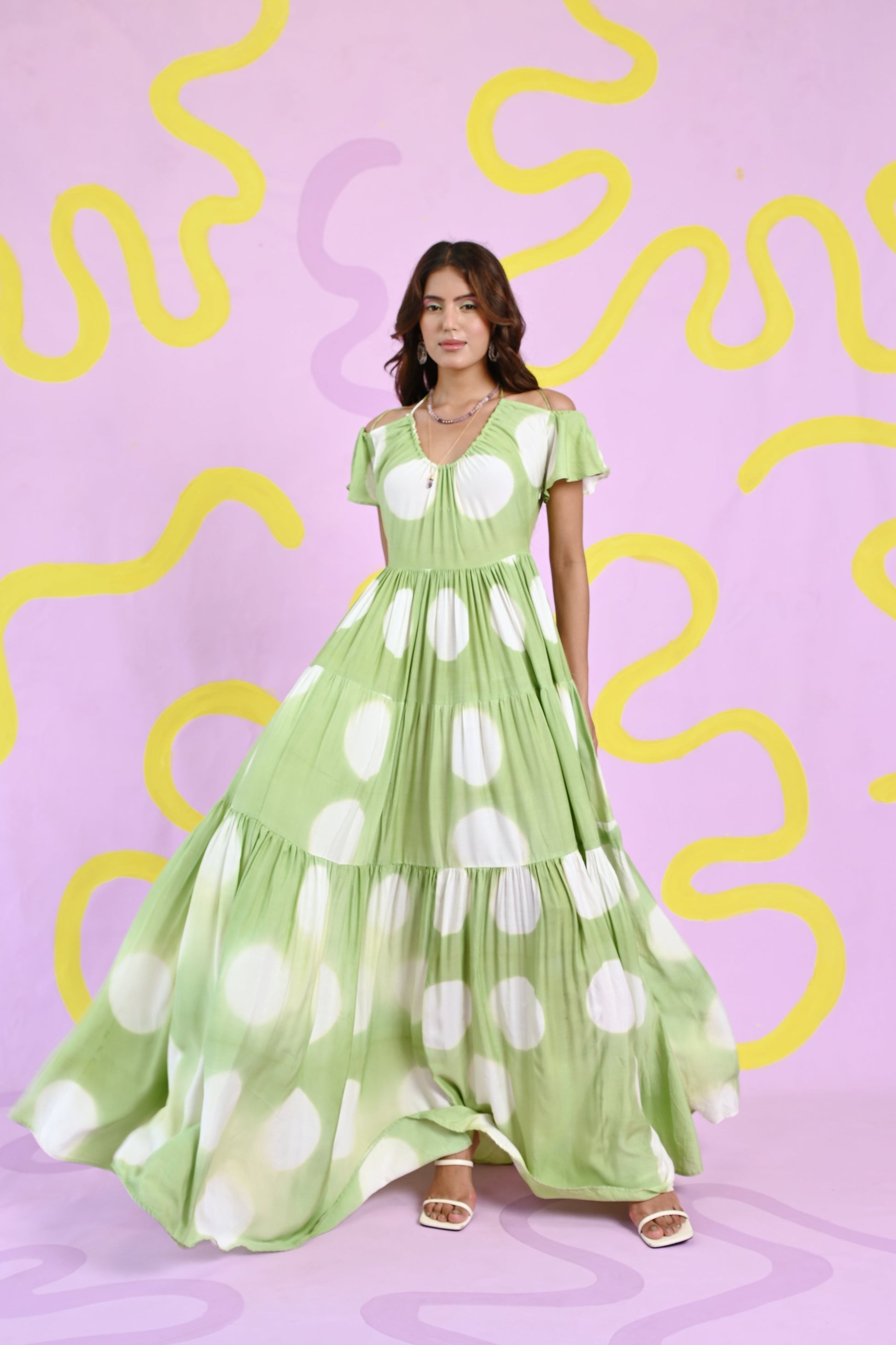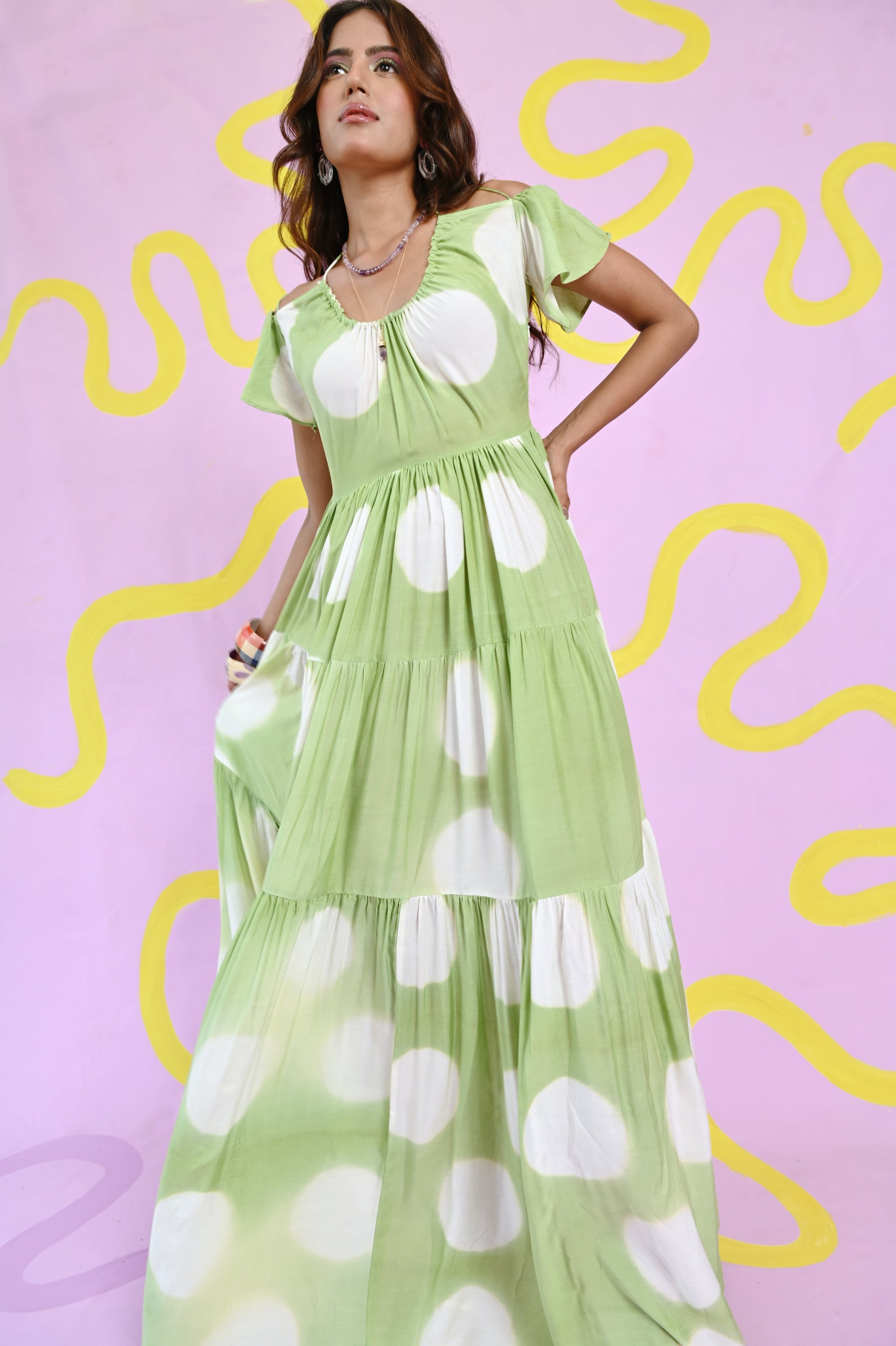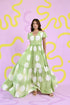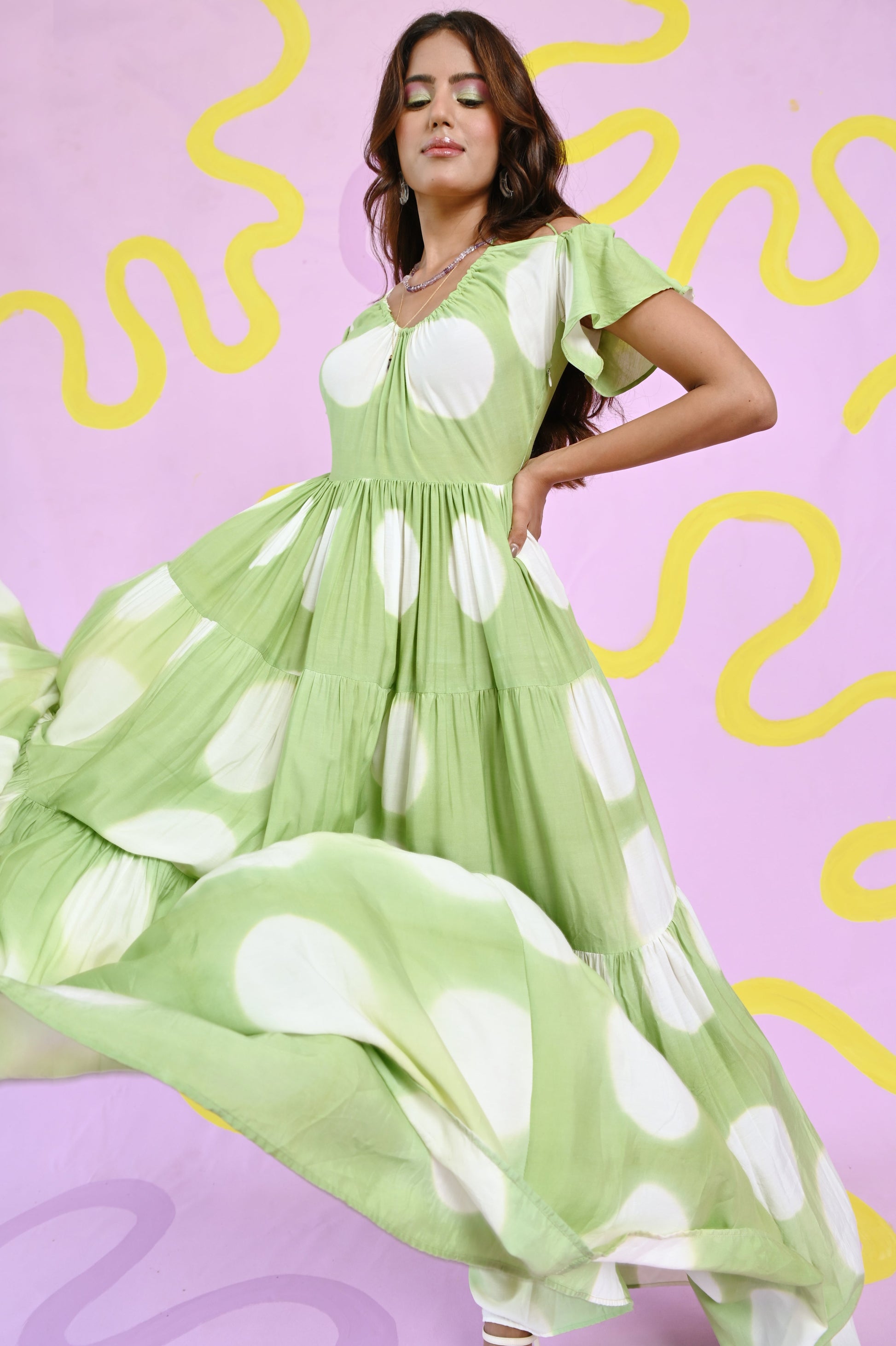 Show off your style with the Dreamer Maxi Dress. This one-of-a-kind piece is crafted using 7 meters of fabric, with a clamp dye in hues of green for an eye-catching look. With delicate muslin silk and detailing at the neckline, plus 3 layers for extra fall, this is the perfect statement piece for any wardrobe!
