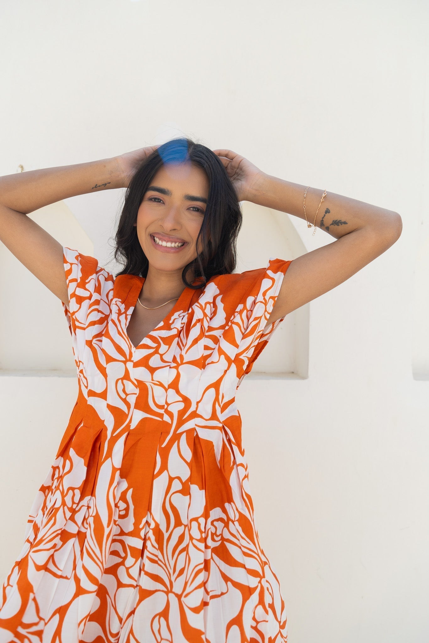 Embrace effortless elegance with our Golden Hour Maxi Dress in a radiant sunset orange hue. The flowy silhouette gracefully drapes over the body, offering a flattering yet relaxed fit. Its V-neckline adds a hint of allure, while the effortless movement of the fabric creates a dreamy, ethereal aesthetic. Whether you're strolling along the beach, attending a garden soir??e, or simply enjoying a sunlit afternoon, this dress makes every moment feel magical. Crafted from?ÿluxurious muslin silk, this dress features a hand screen-printed design in a playful, artistic tone, making it a standout piece for any occasion. The fluid drape and lightweight fabric ensure comfort while exuding a breezy, ethereal charm.