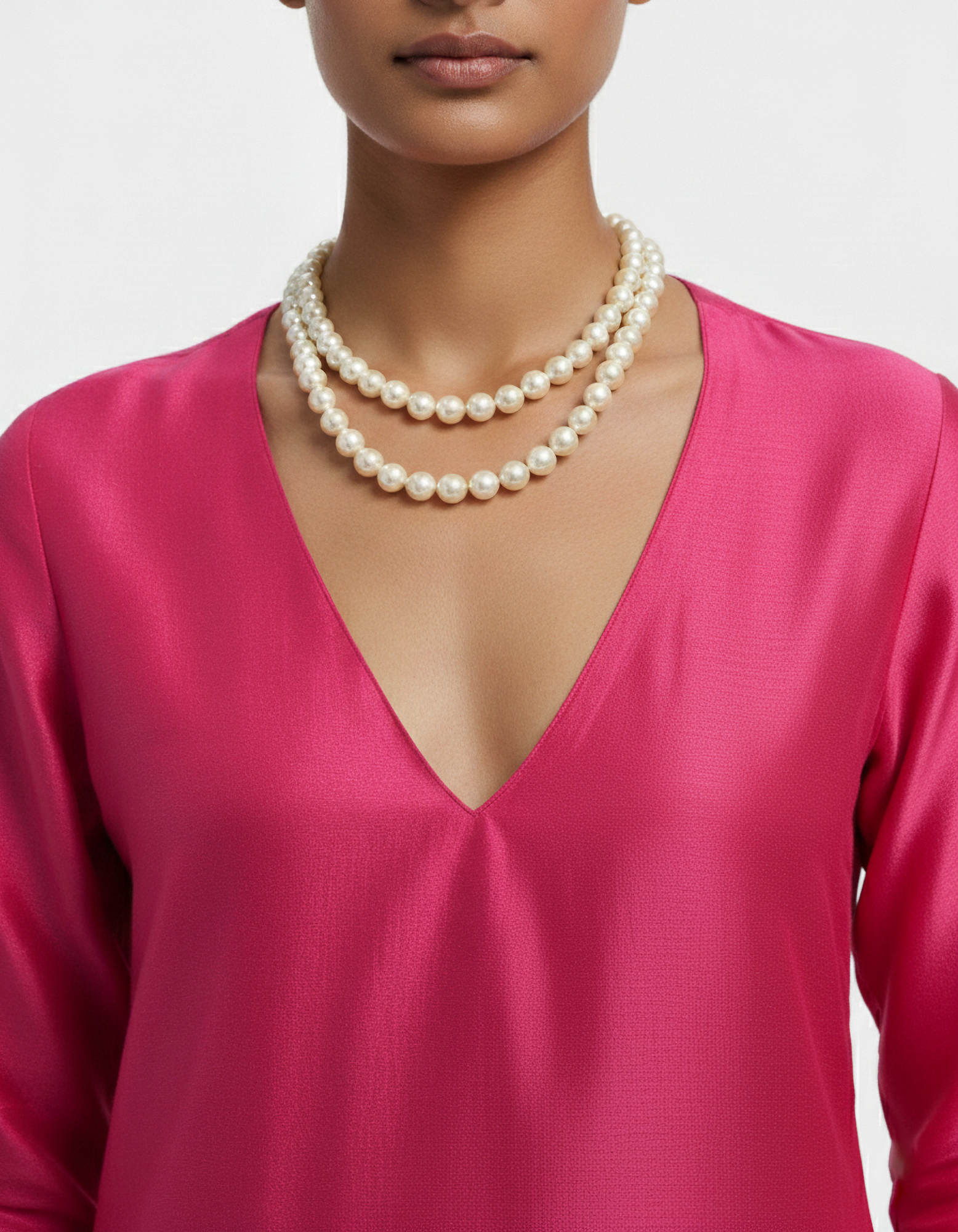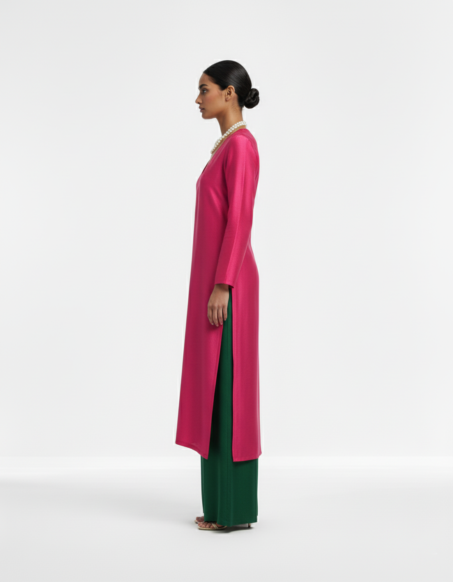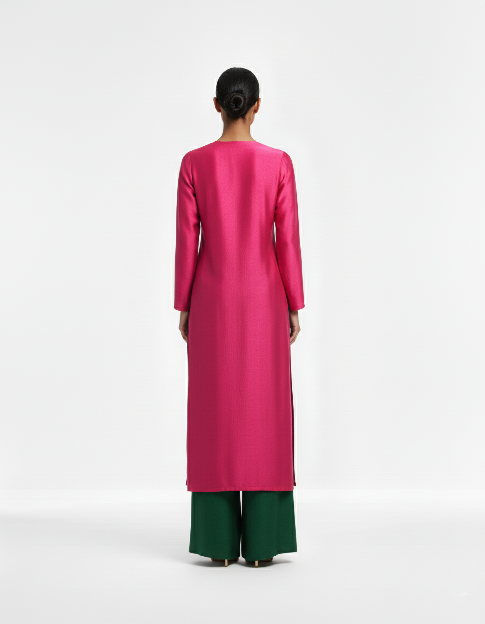 The Kurta: This exquisite set features a commanding long-line kurta in a dazzling Gulabi (hot pink/fuchsia)hue. Crafted from premium Raw Silk, its lustrous finish and elegant drape speak volumes of its quality. The kurta is designed with a sophisticated deep V-neckline that gracefully elongates the frame, and classic full-length sleeves. High side slits ensure ease of movement while adding a touch of contemporary flair.