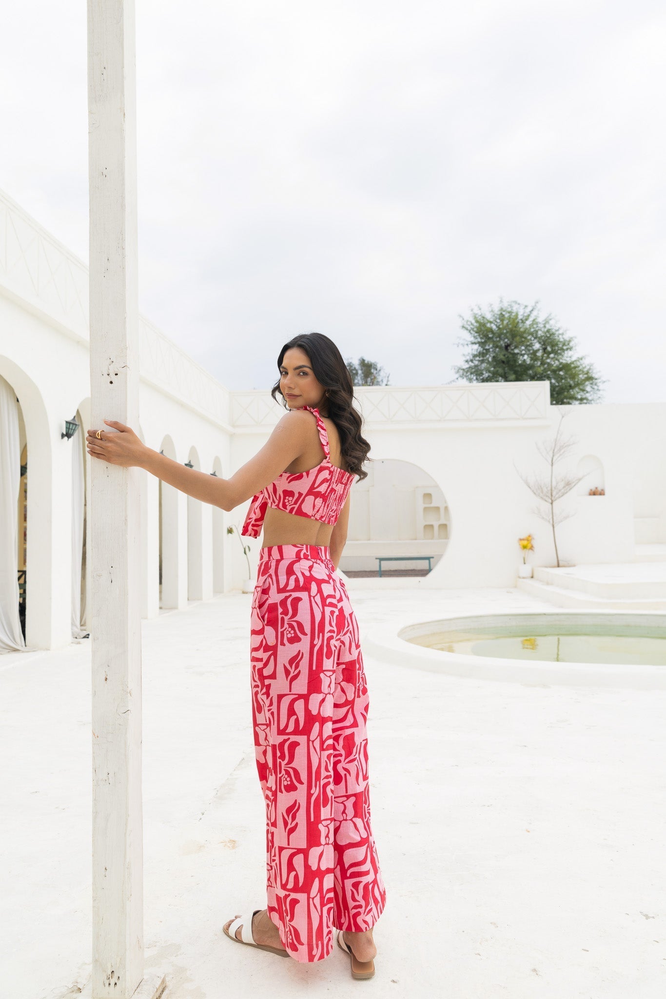 Unleash your bold & carefree spirit with the Soulmate Co-Ord Set ???Ÿƒ??. Designed for effortless elegance & playful charm, this hand screen-printed beauty is crafted from 100% breathable cotton ???¨, making it your go-to for both casual outings & special occasions. The flirty knotted crop top with ruffled straps pairs perfectly with the high-waisted, flowy pants, creating a statement look that's both chic & comfortable ????.