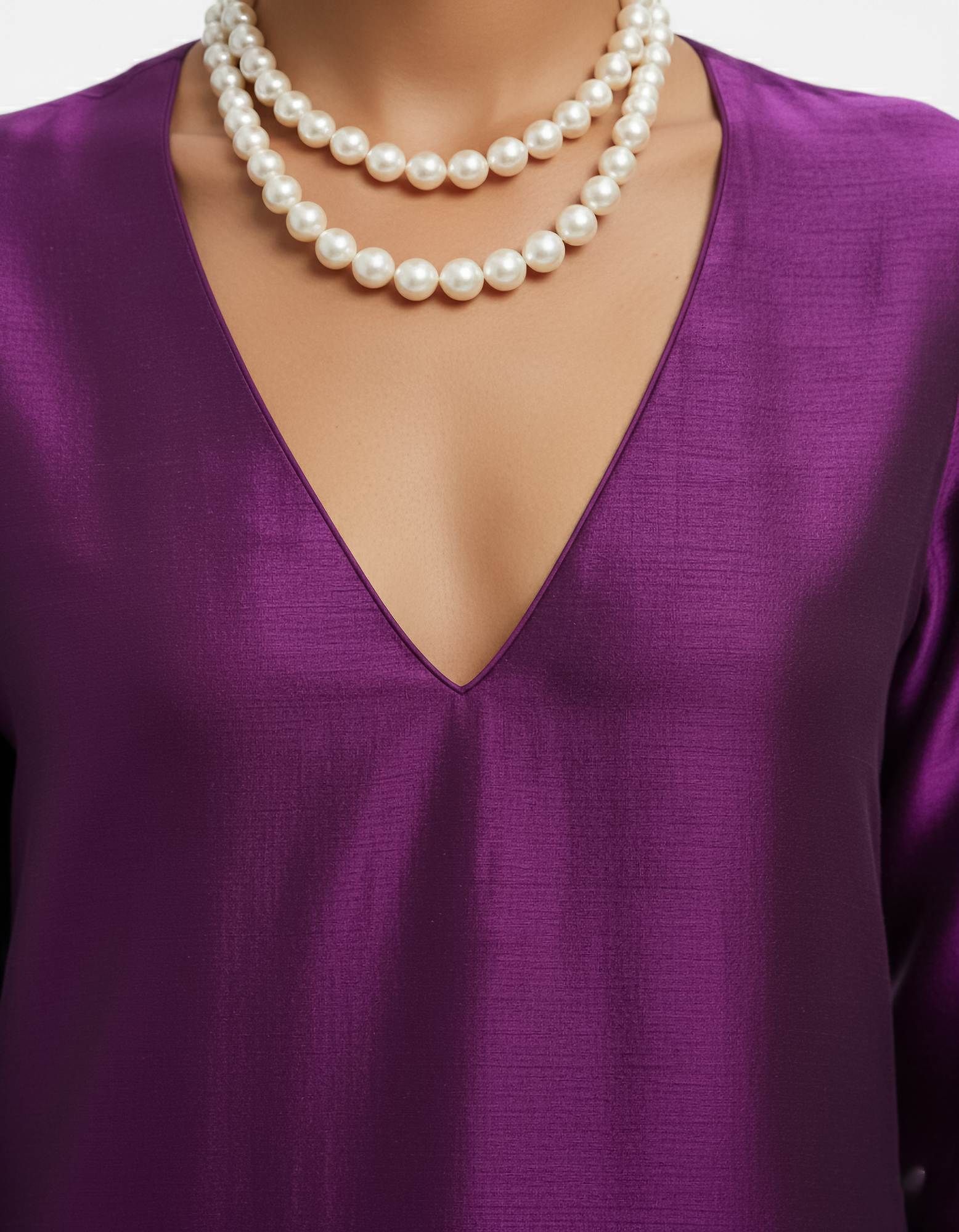The Kurta: The set features a stunning long-line kurta in a mesmerizing deep Jamuni (purple) hue. Made from premium Silk, its subtle sheen and beautiful drape exude an understated grandeur. The kurta is designed with a chic deep V-neckline that elongates the silhouette, and elegant full-length sleeves that add to its classic appeal. High side slits offer ease of movement and a contemporary touch.