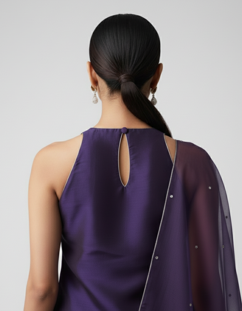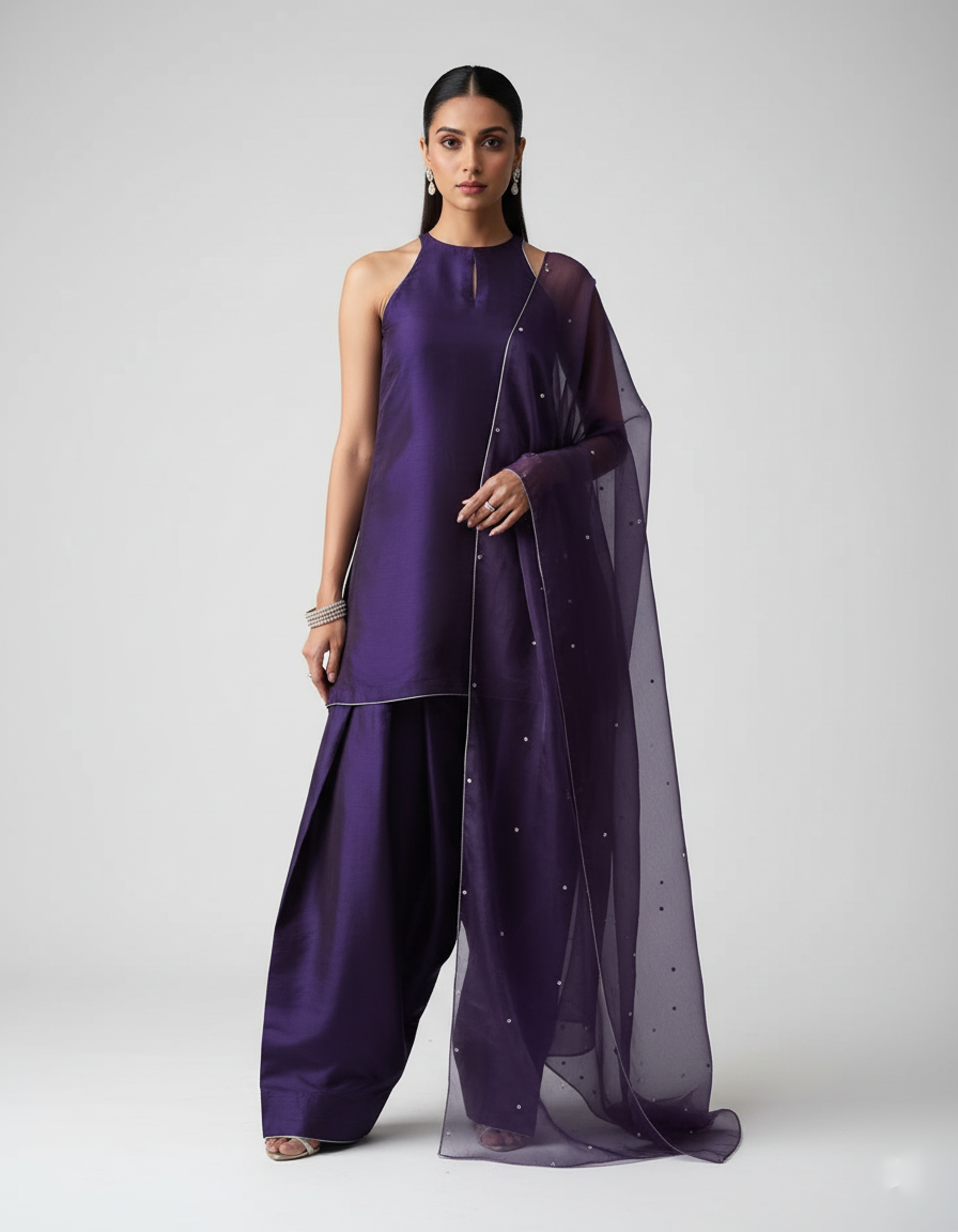 The Kurta: At the heart of the Nain Tara Set is a sophisticated sleeveless halter-neck kurta, featuring a chic keyhole detail at the collar. Crafted from rich Raw Silk, its substantial yet graceful drape creates a flattering silhouette. The kurta's elegant simplicity allows its vibrant color - mesmerizing Regal Purple for a touch of drama – to truly shine.