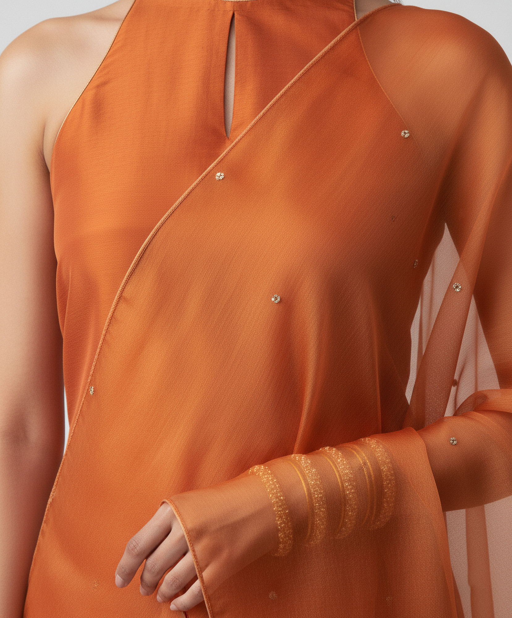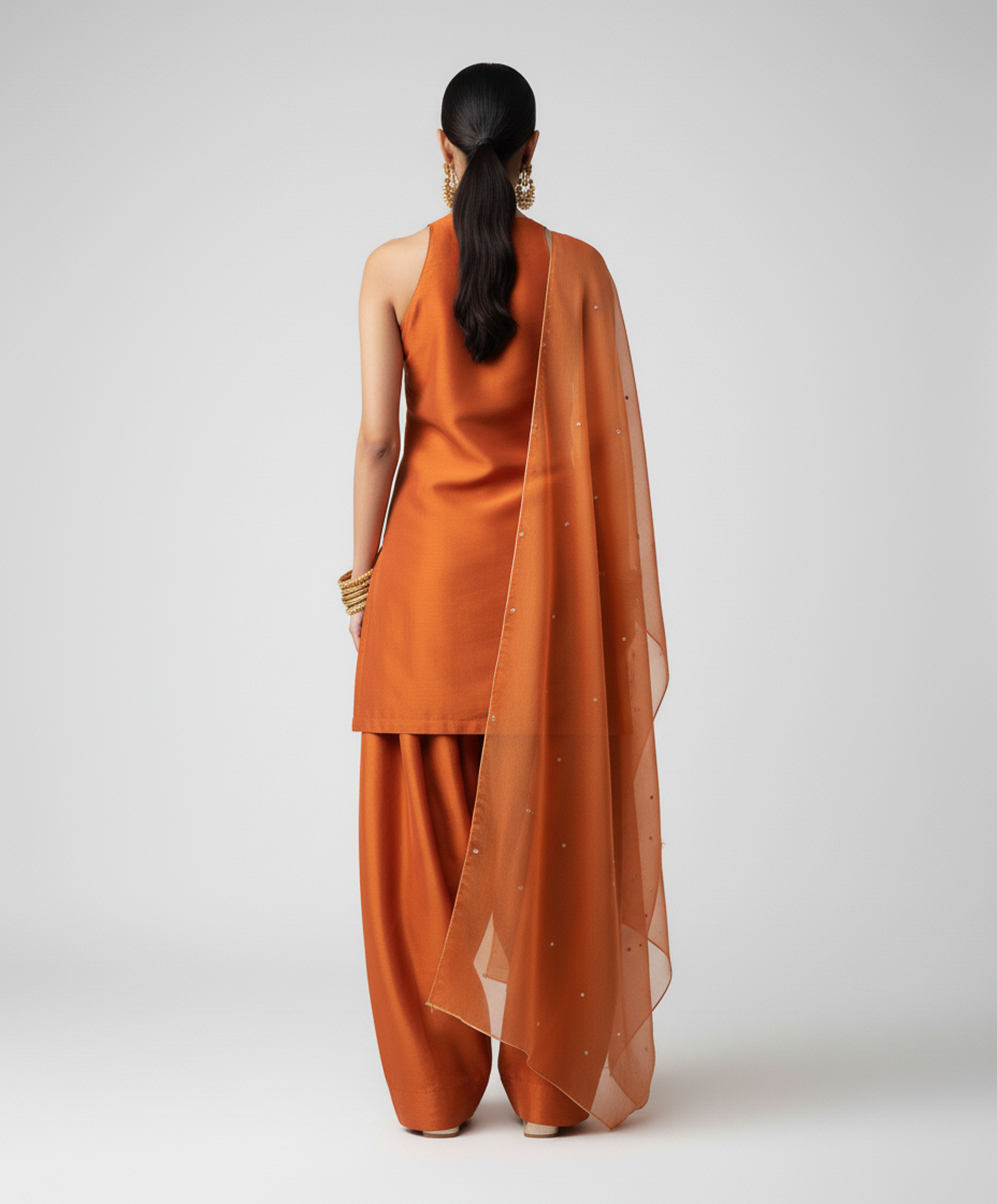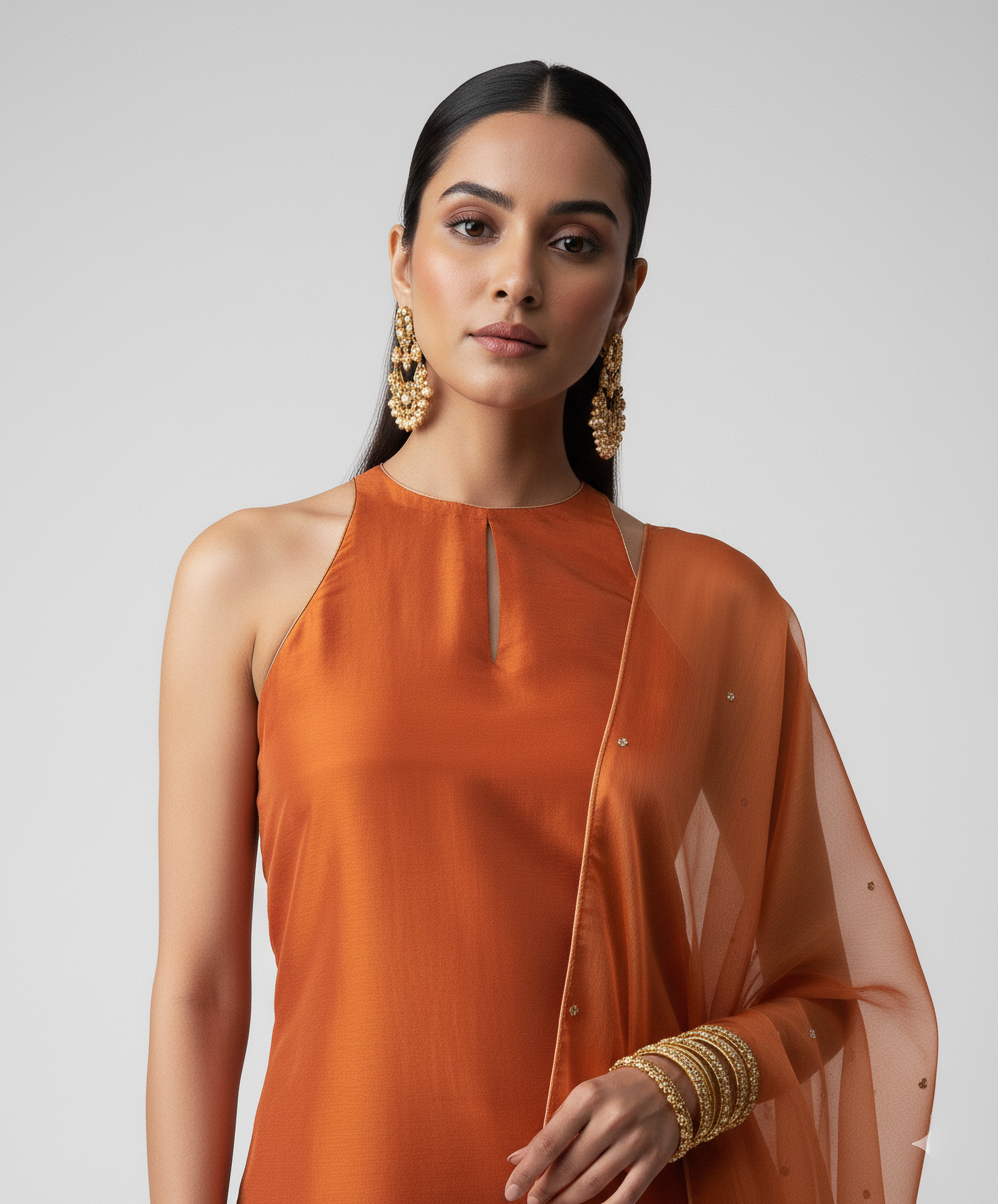 Embrace timeless elegance with the stunning Narangi Set, a vibrant ensemble crafted for sophisticated style. This exquisite set features a chic halter-neck kurta and matching pants, both fashioned from luxurious raw silk in a captivating shade of Narangi (orange). The smooth, rich texture of the silk drapes beautifully, offering both comfort and a regal appearance.