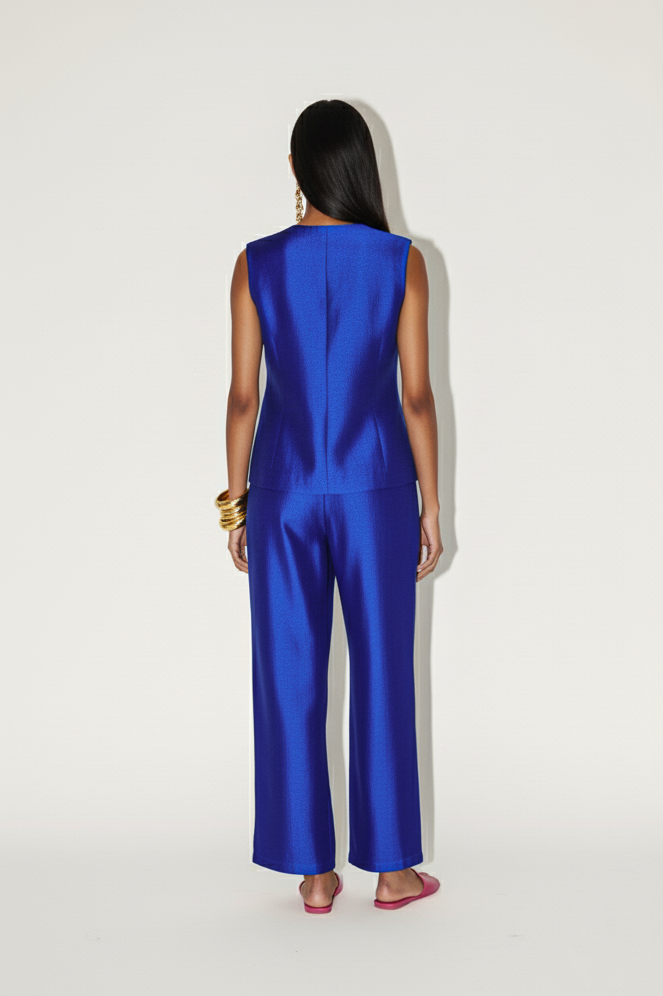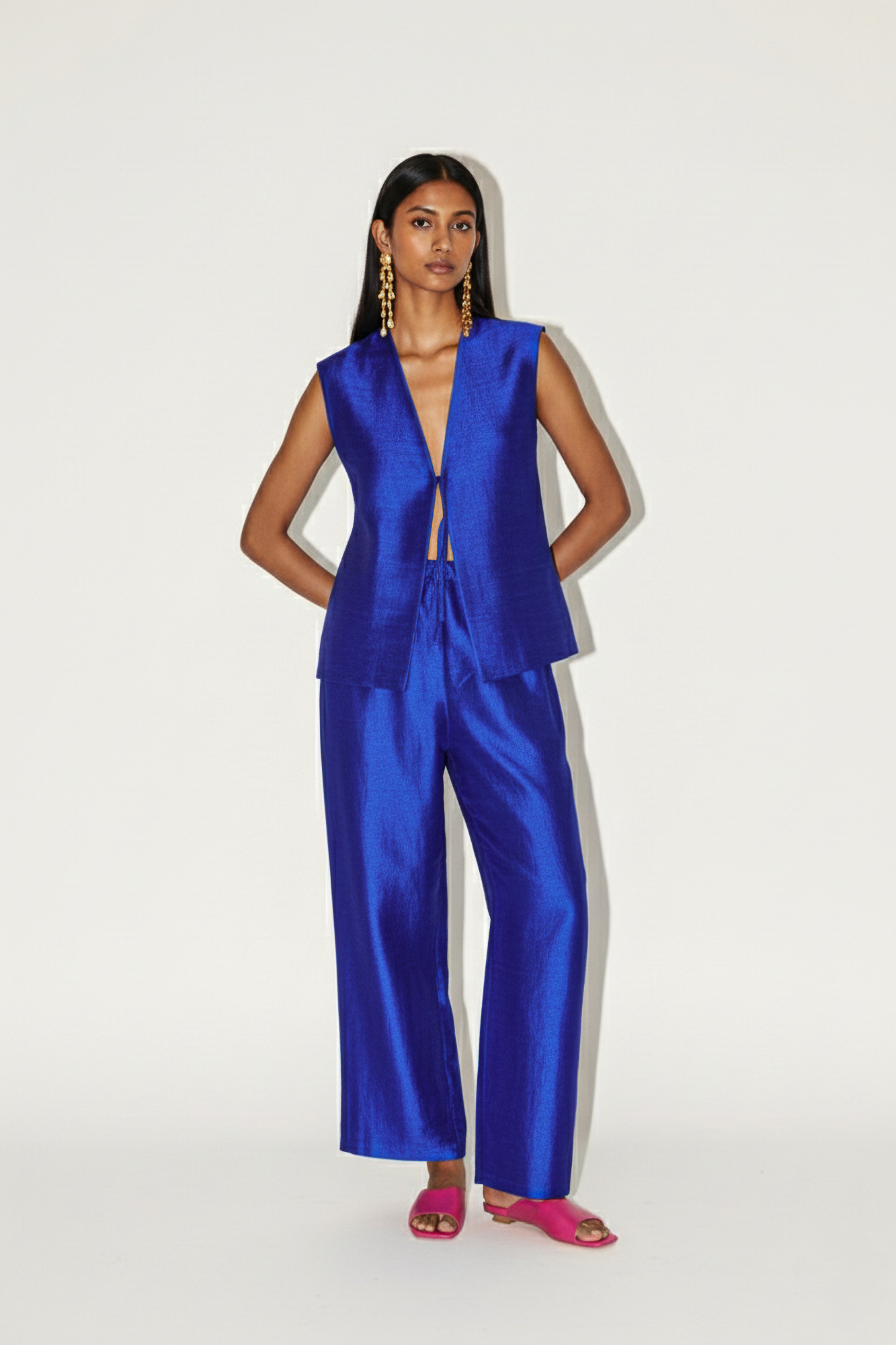 The Top: This ensemble features a chic sleeveless V-neck top in a stunning royal blue hue. Made from premium Silk, its lustrous finish and structured yet fluid drape offer a sophisticated silhouette. The top is designed with a front tie-up detail, allowing for a versatile fit and a touch of modern charm, while its slightly extended length provides elegant coverage.