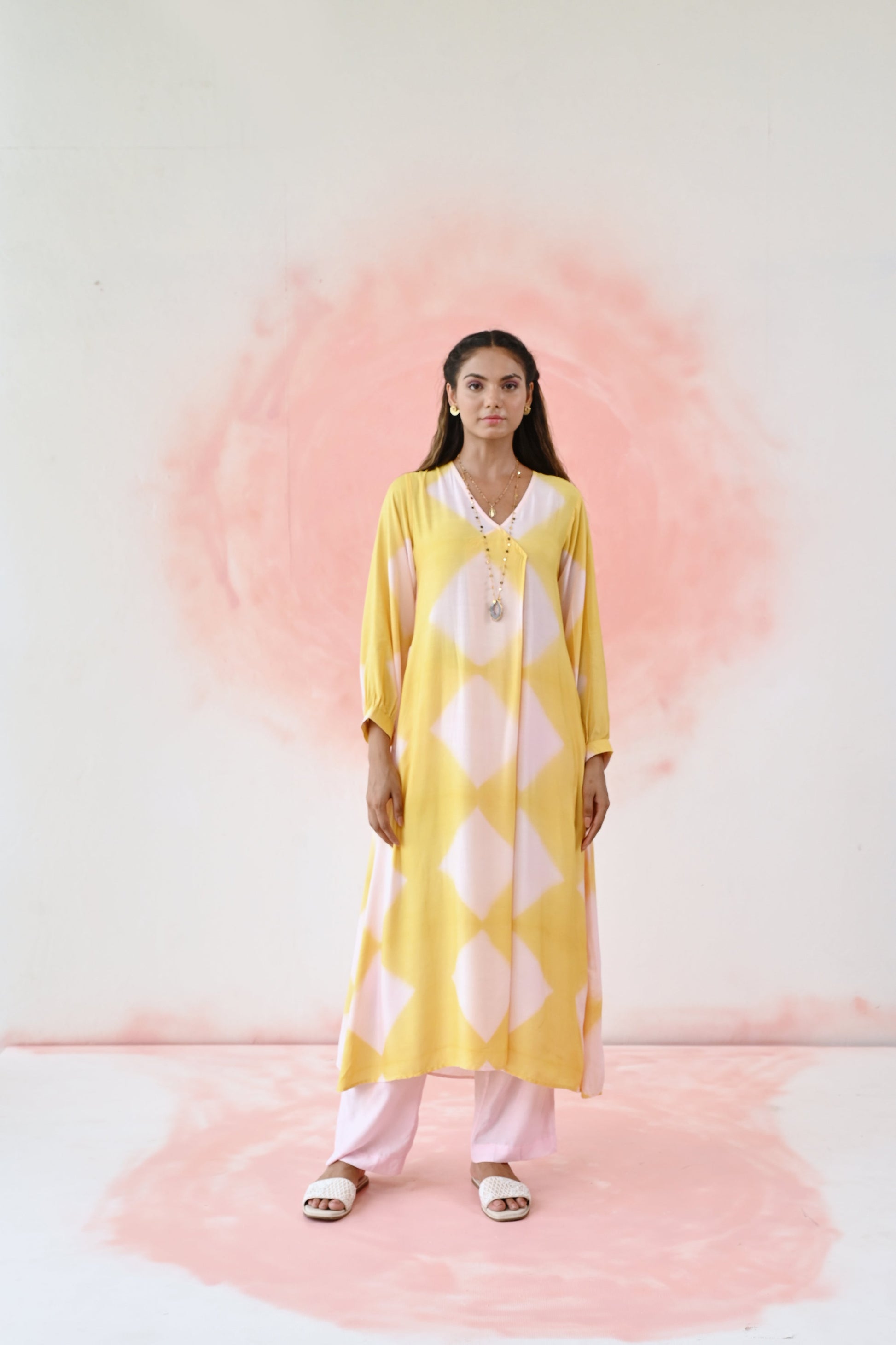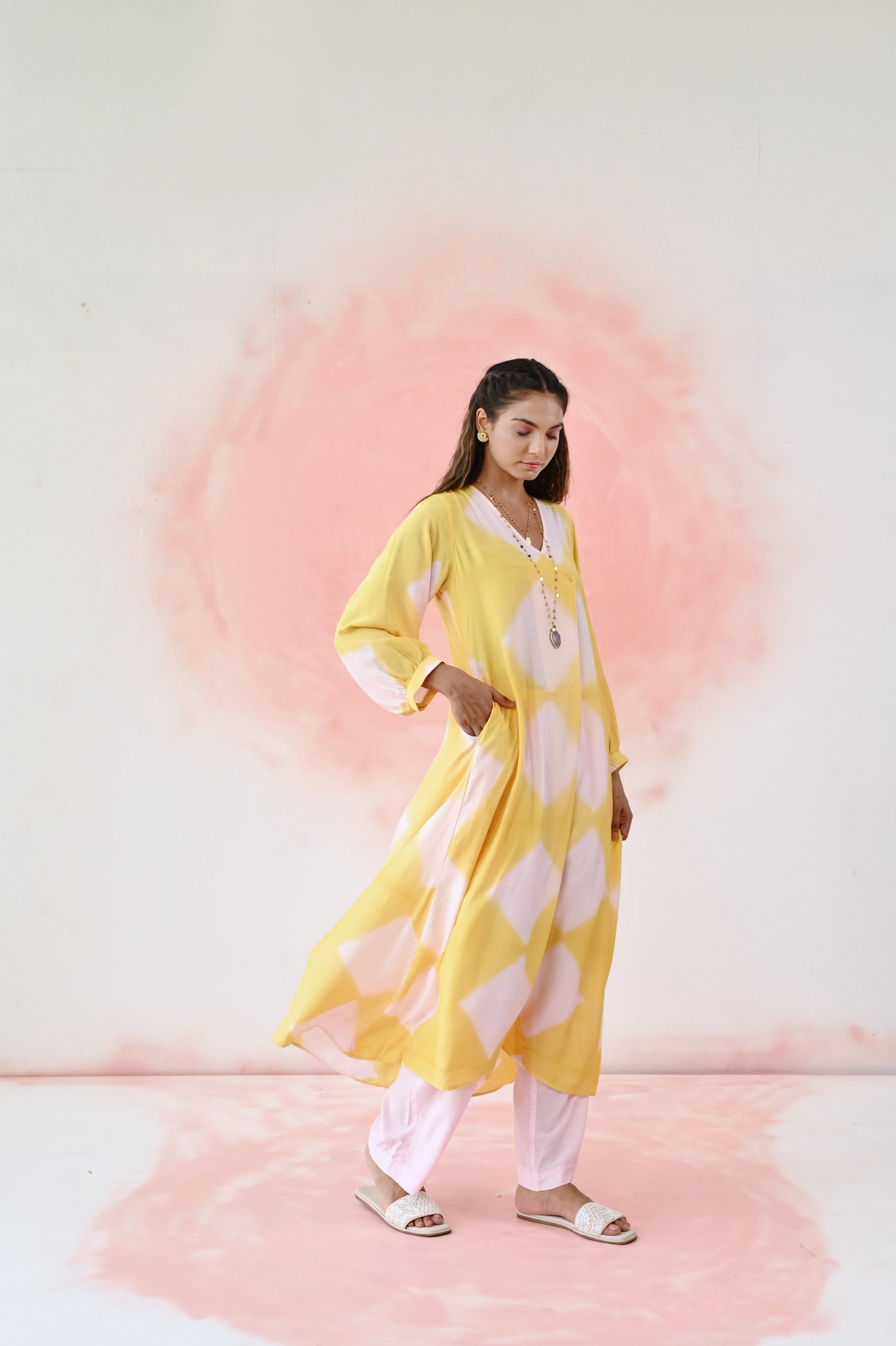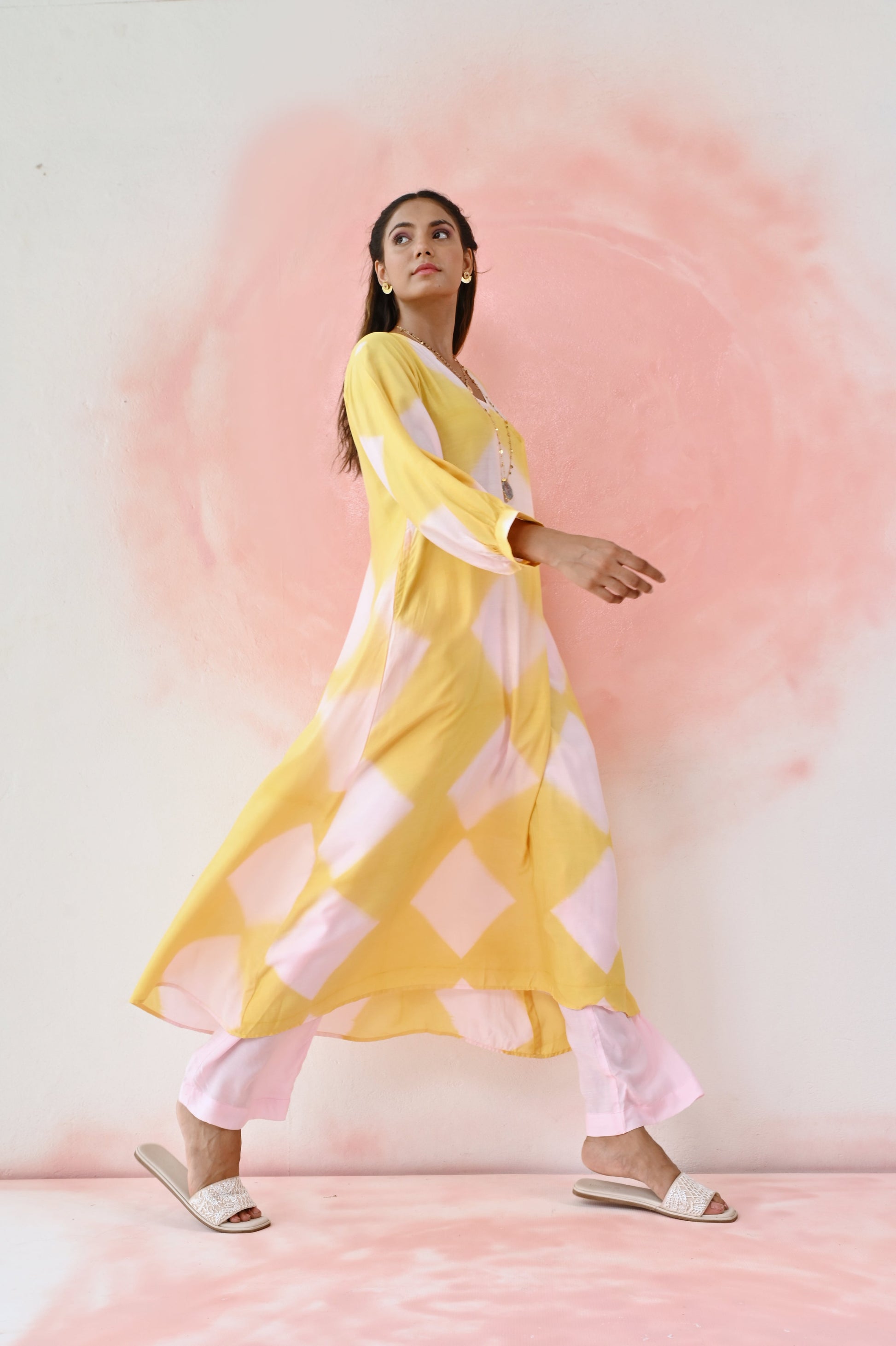 This Ocean Breeze Co-ord Set is made of muslin silk with AZO-free dye, making it gentle on the skin. The set includes a hand dyed clamp dyed kurta with a v-neckline and flared sleeves, paired with mist pink pants for a classic silhouette. Perfect for the upcoming festive season.