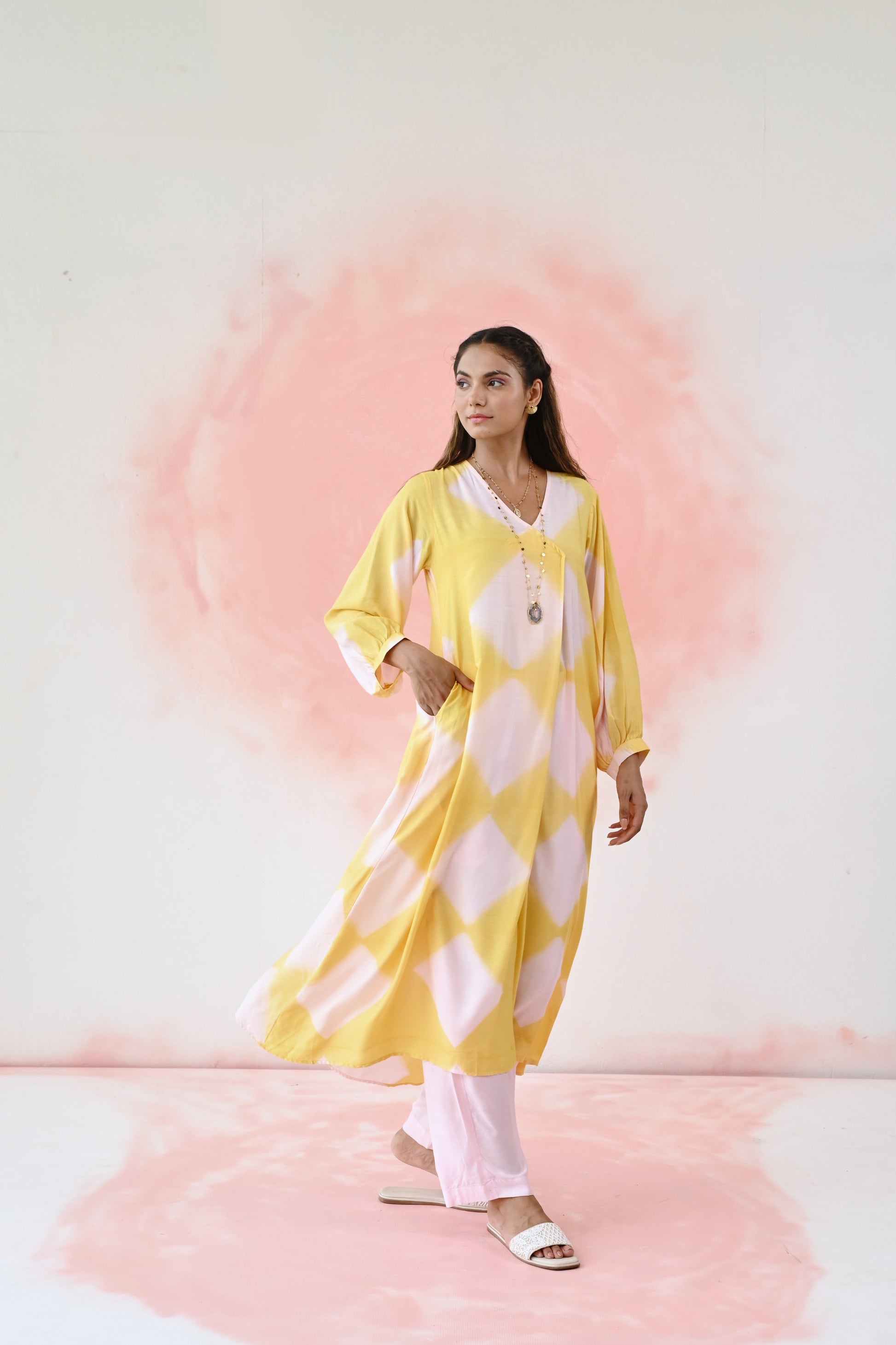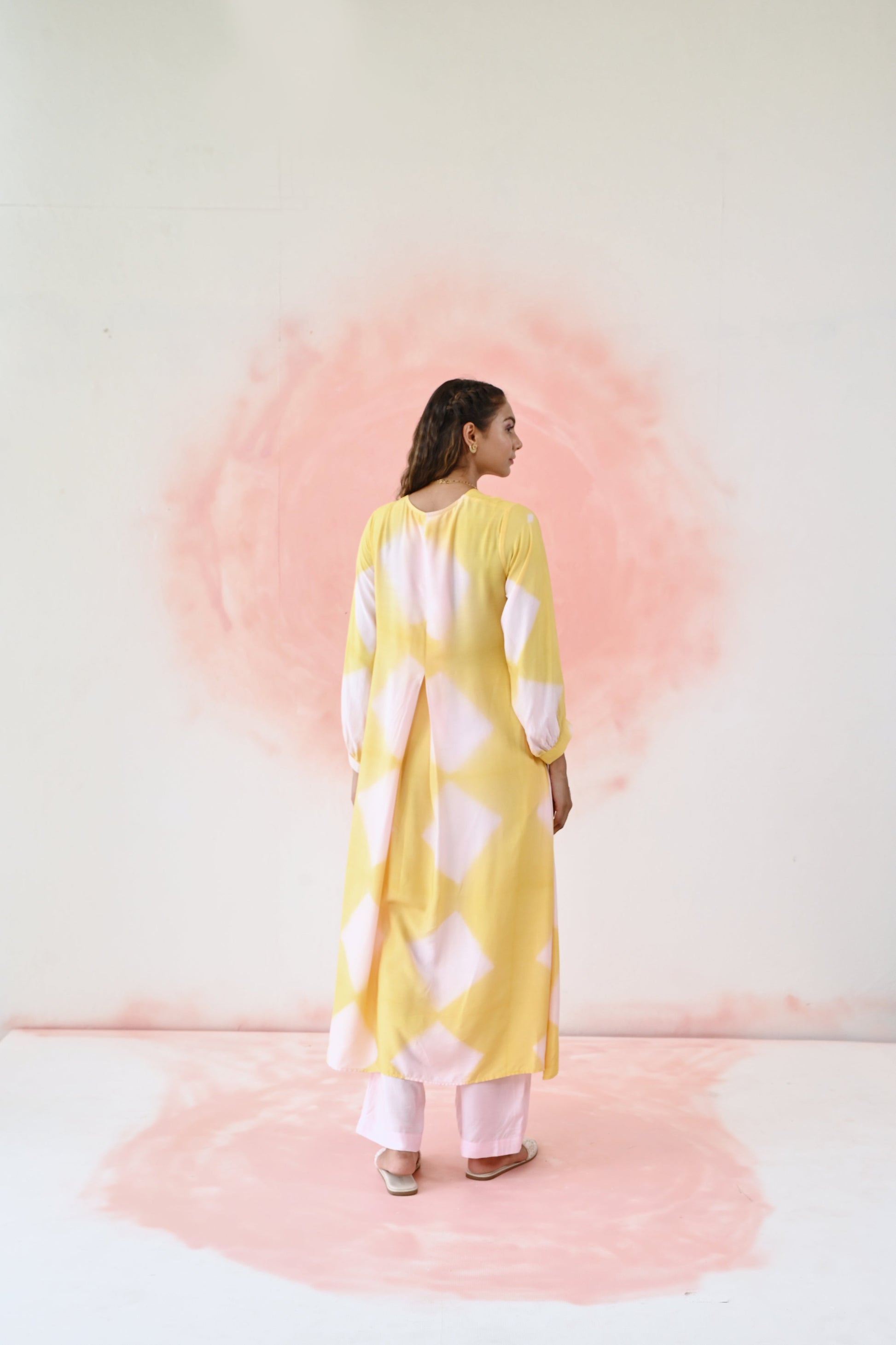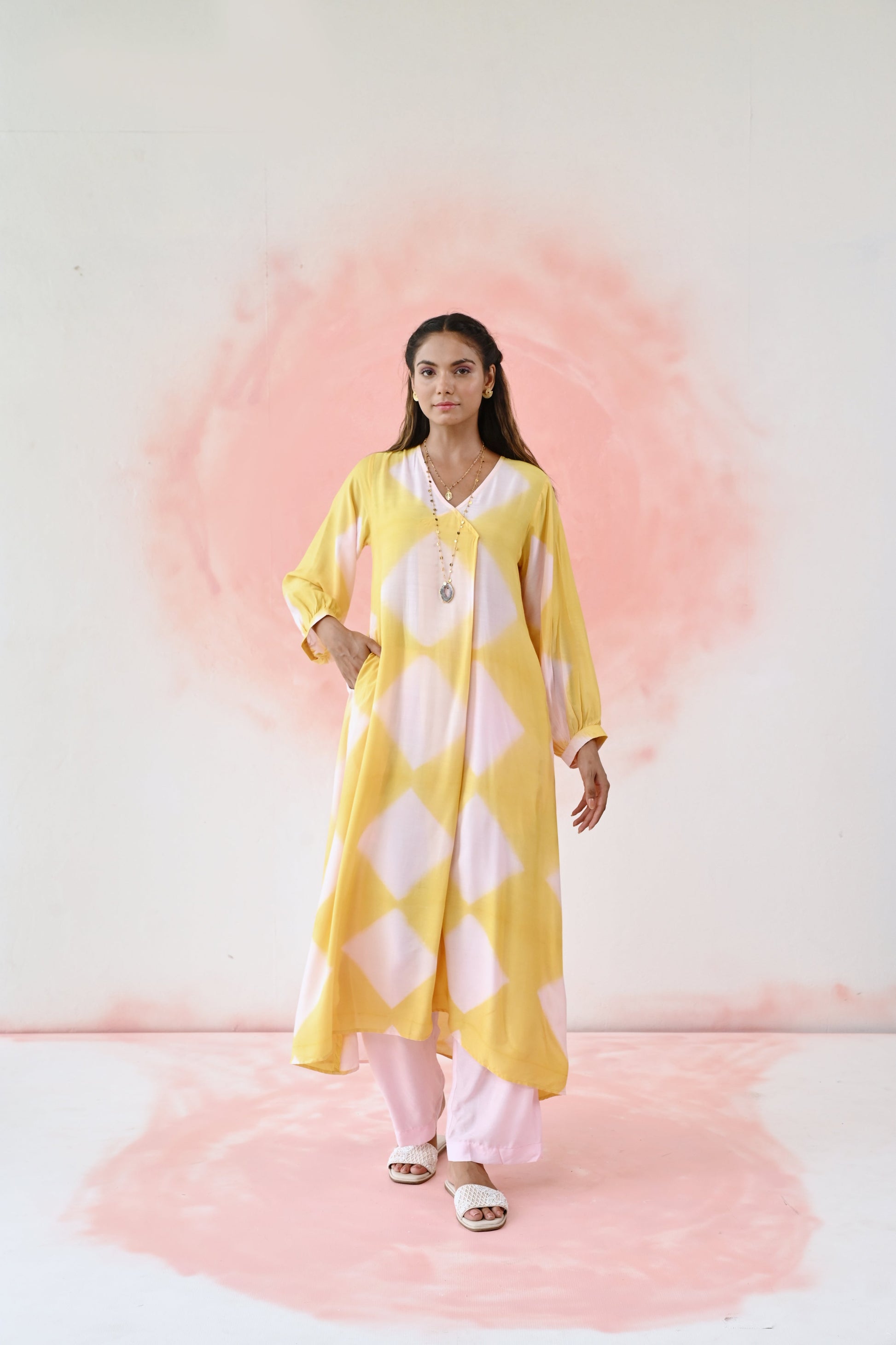 This Ocean Breeze Co-ord Set is made of muslin silk with AZO-free dye, making it gentle on the skin. The set includes a hand dyed clamp dyed kurta with a v-neckline and flared sleeves, paired with mist pink pants for a classic silhouette. Perfect for the upcoming festive season.