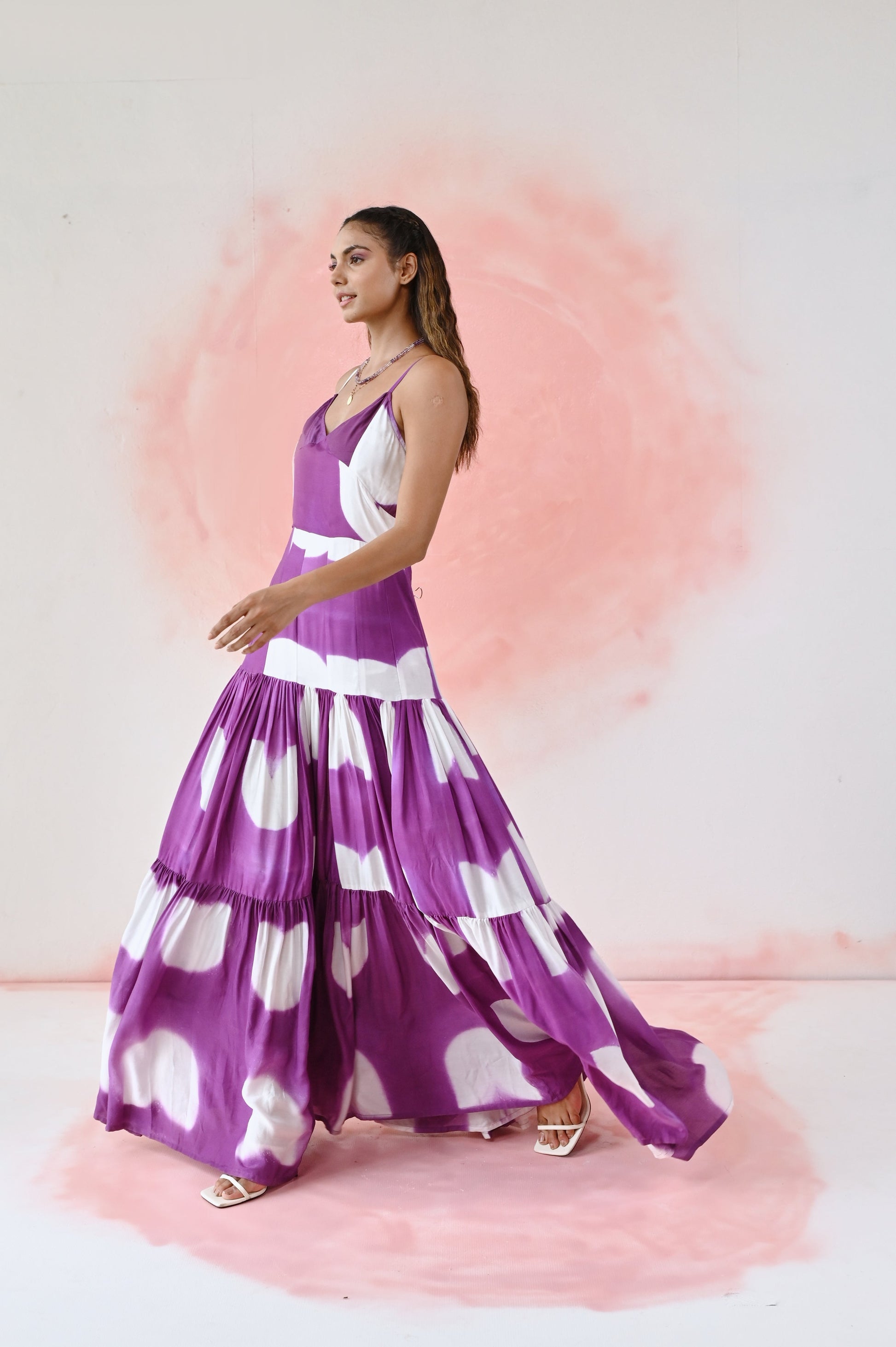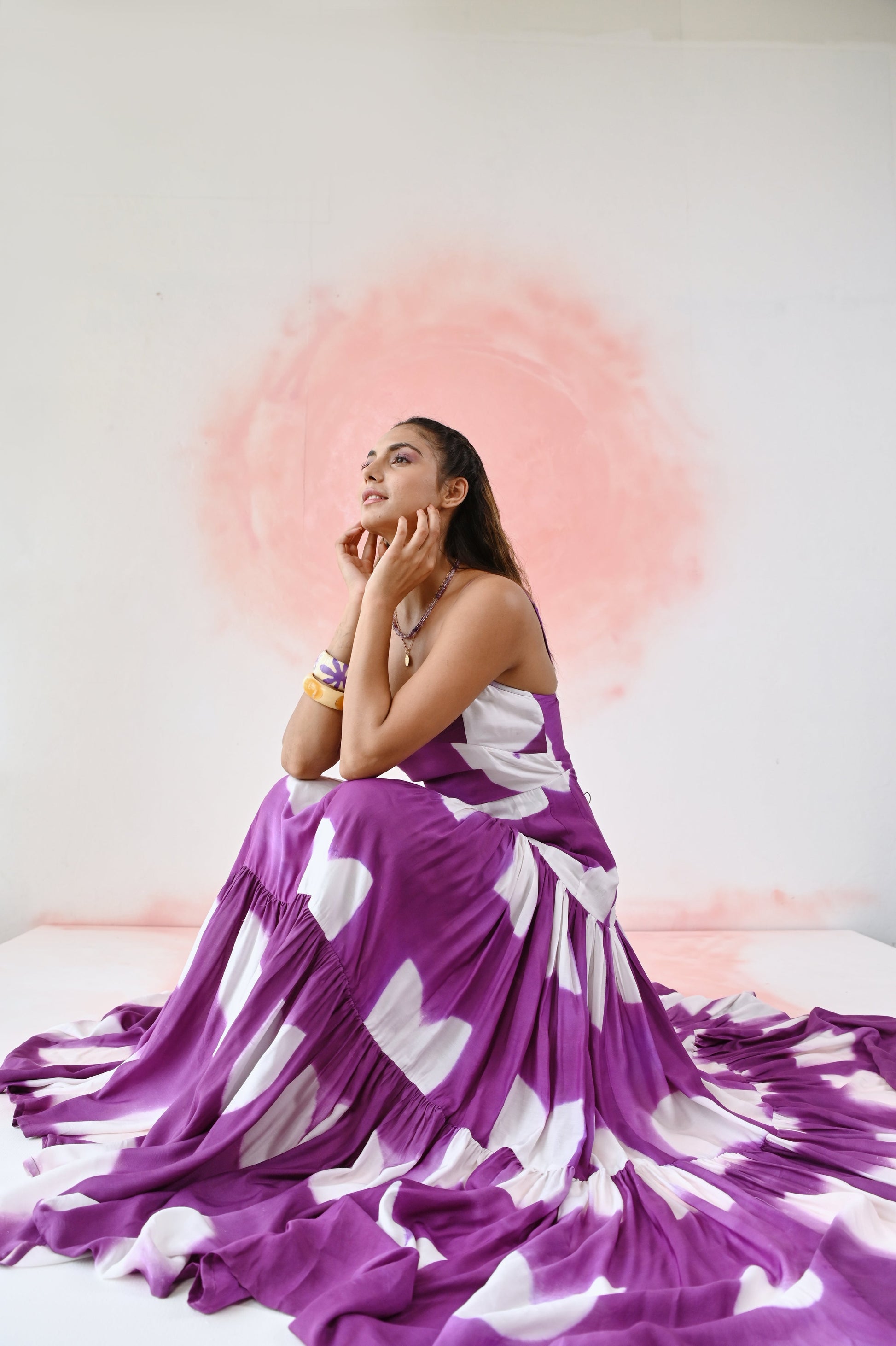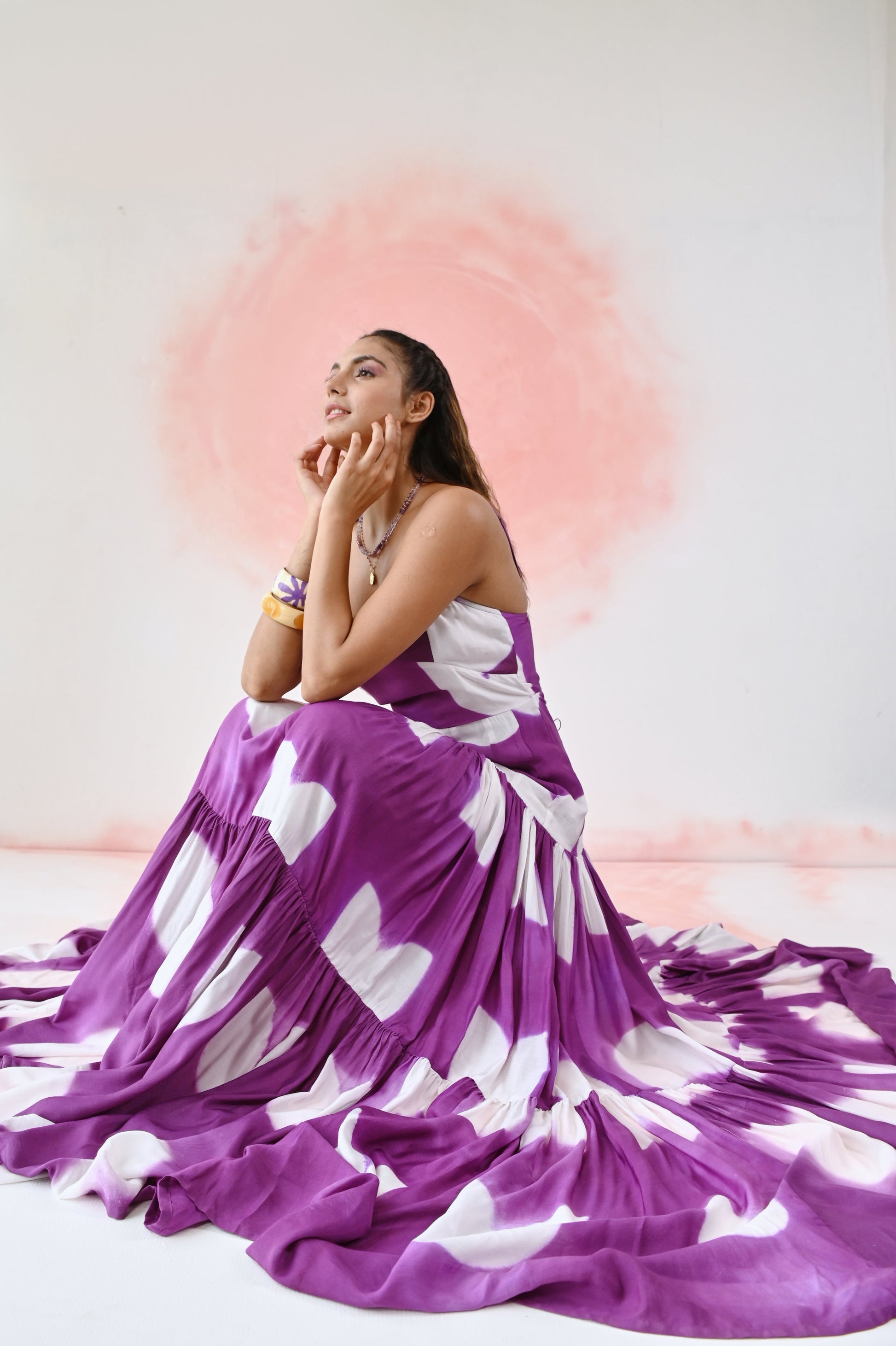 Be the belle of the ball with this stunning Mermaid Frill Dress! Crafted in 7 meters of muslin silk and hand-crafted with clamp dye for an extra special finish, it features 2 layers of frills and adjustable straps for a perfect fit in hues of purple. Get ready for some serious sea-ssational style! ??�?