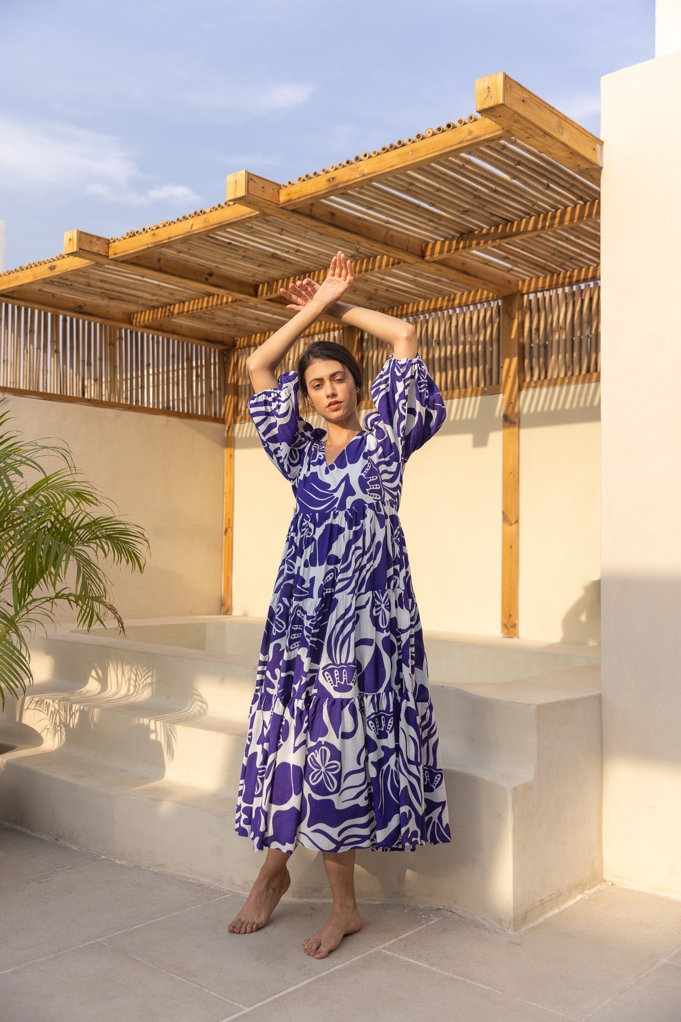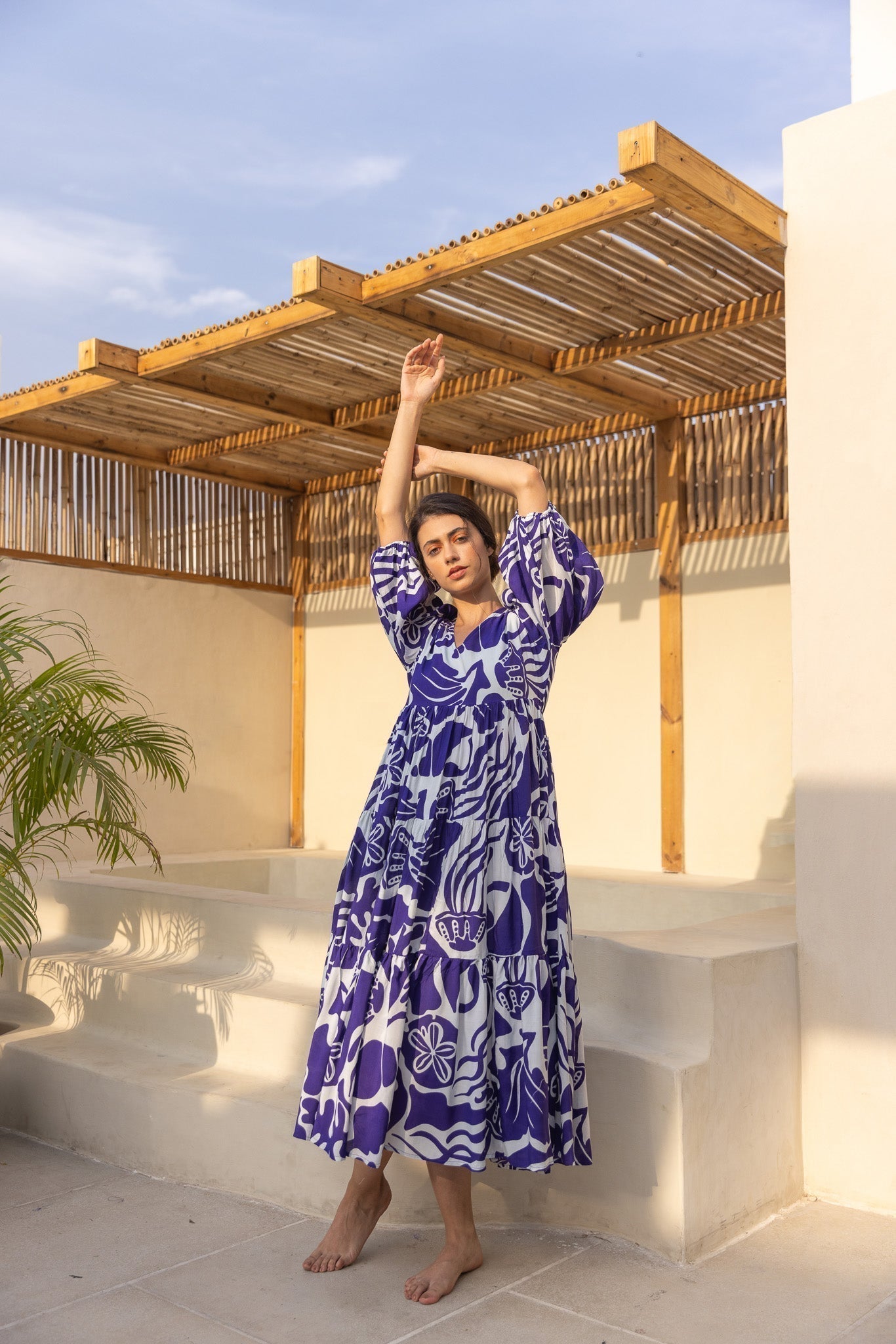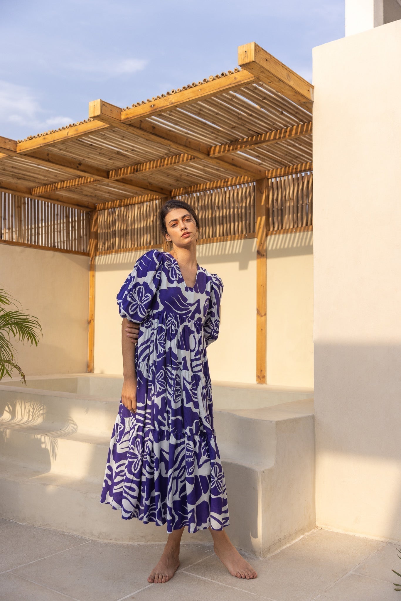 Get ready to make a statement with our Passion Punch Dress! This midi dress features our exclusive print on luxurious Muslin Silk, perfect for making heads turn. The vibrant purple shade, v-neckline, and flared sleeves and hemline will give you the ultimate fit and flare look.