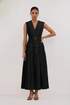 Introducing The Awakening Dress, a powerful blend of tailored precision and romantic volume. Cut from refined black poplin, this sleeveless midi dress features a striking two-part construction that makes an instant, sophisticated statement.