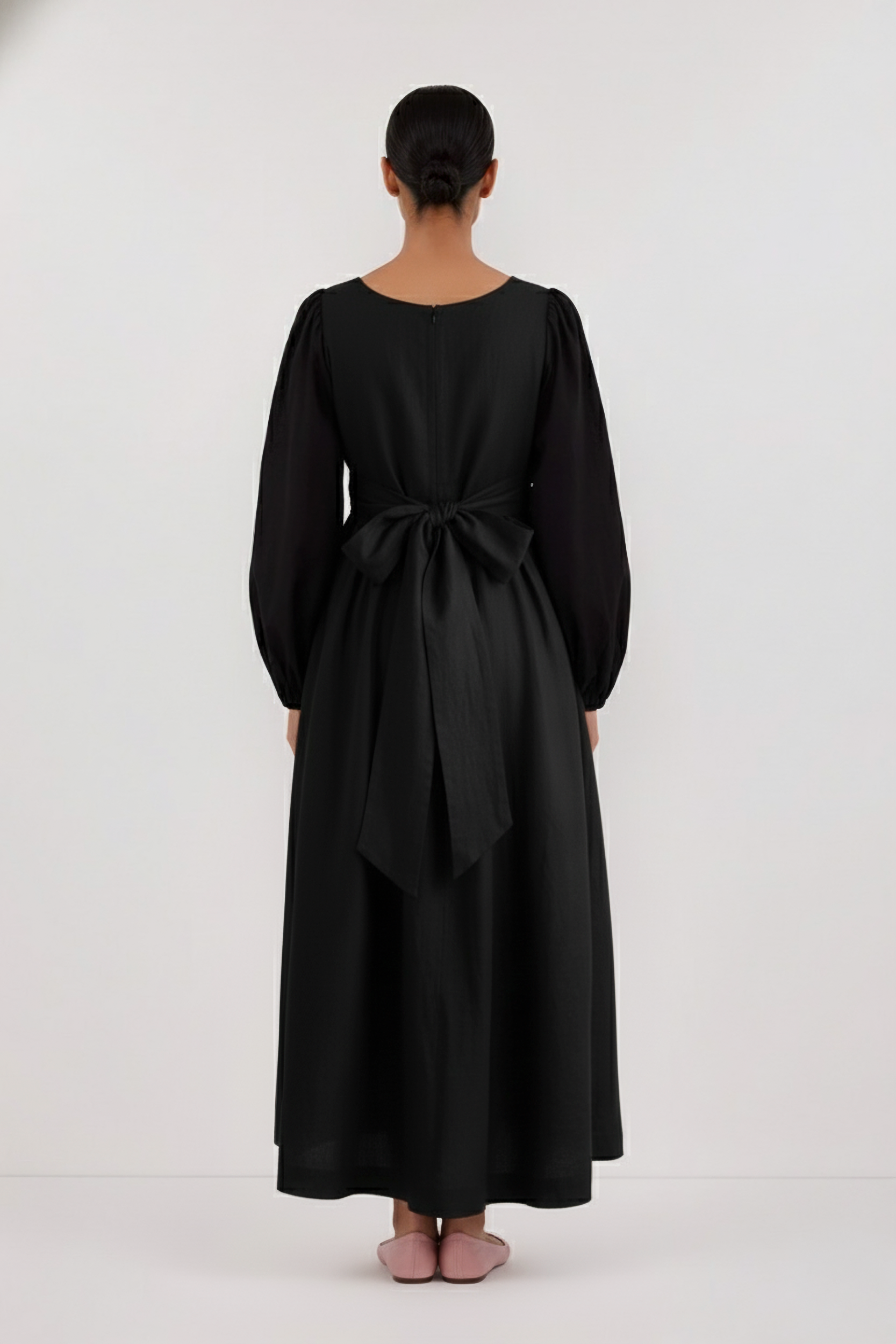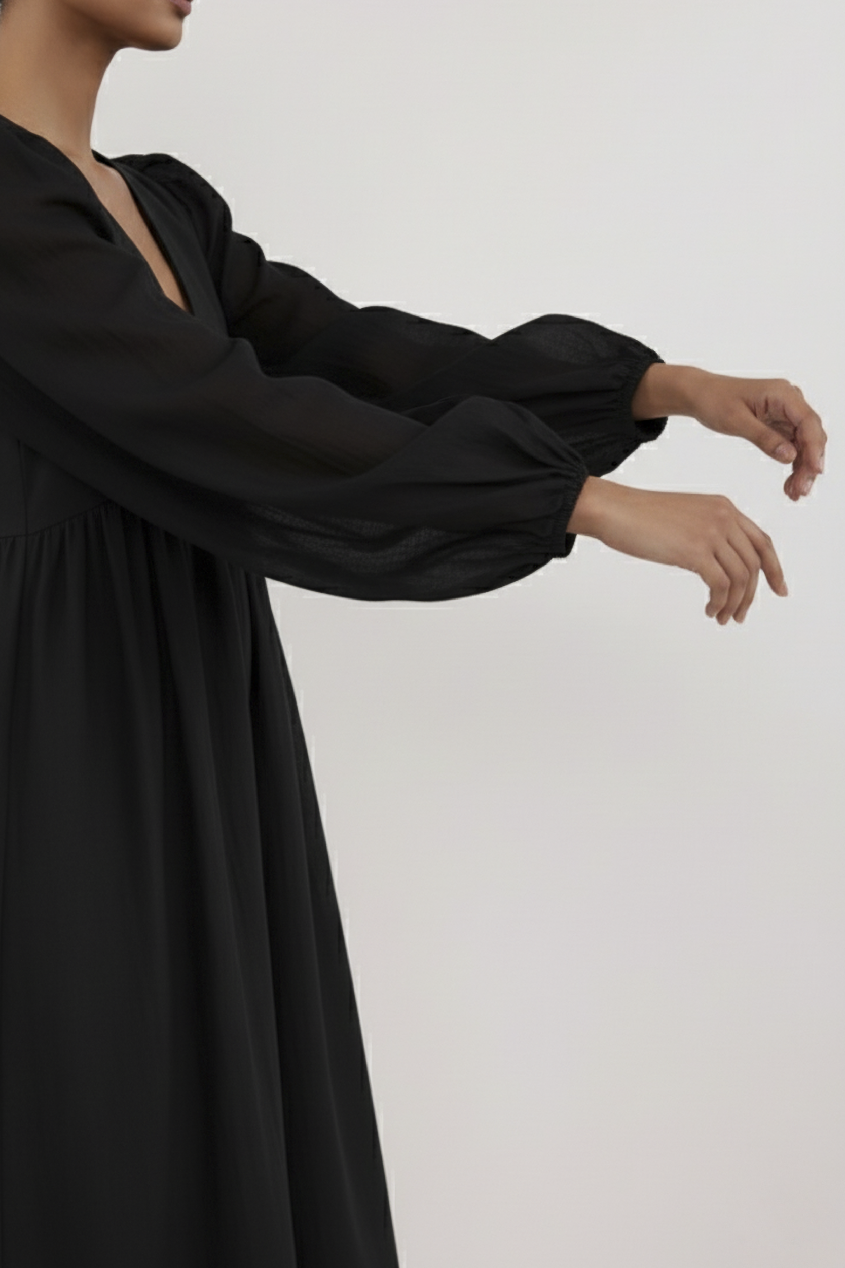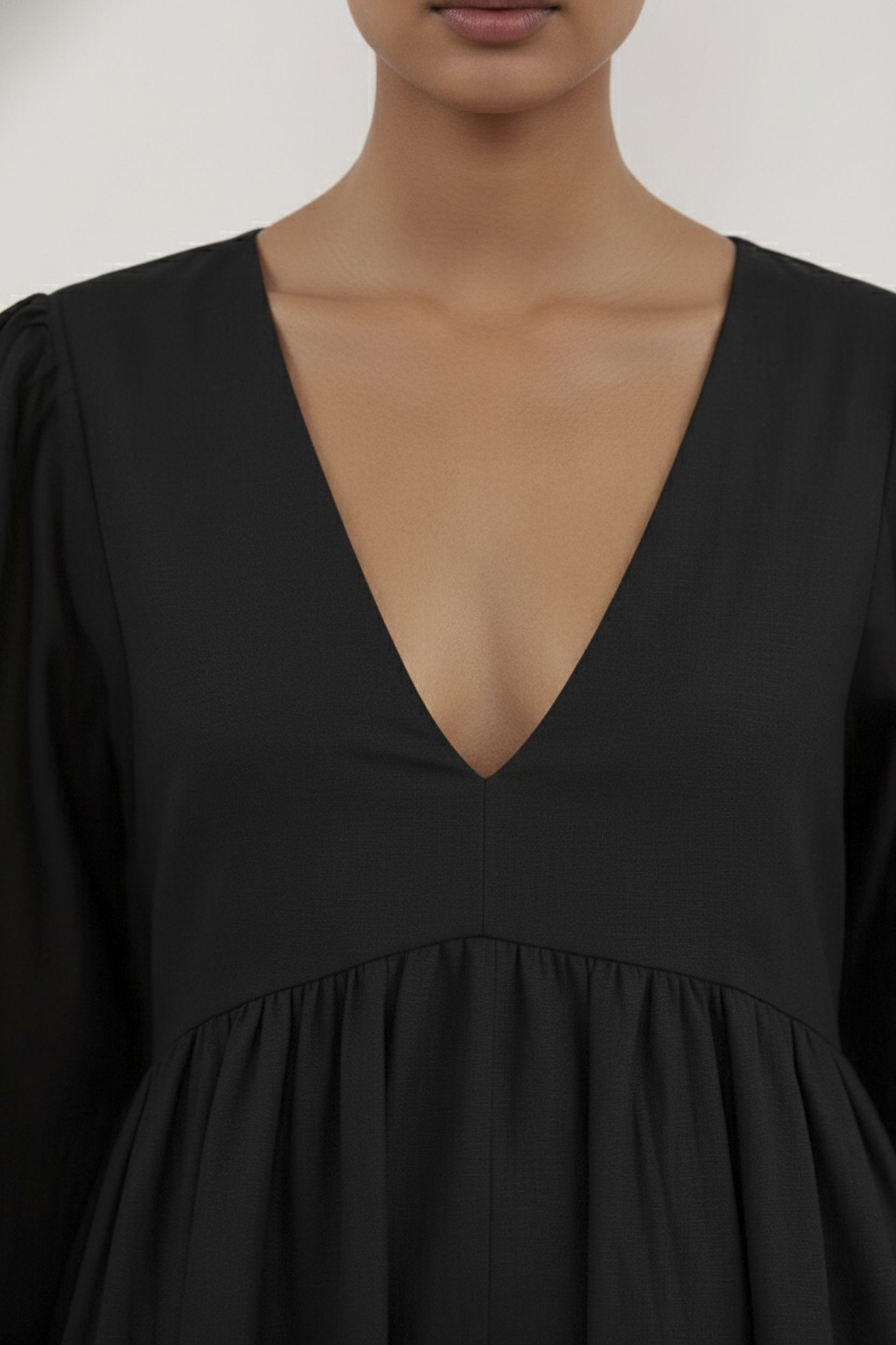 Its defining features include a flattering V-neckline and an empire waist that cinches just below the bust before falling into a gently gathered, relaxed skirt. The dress is balanced by elegant long balloon sleeves, adding a touch of romance and volume.