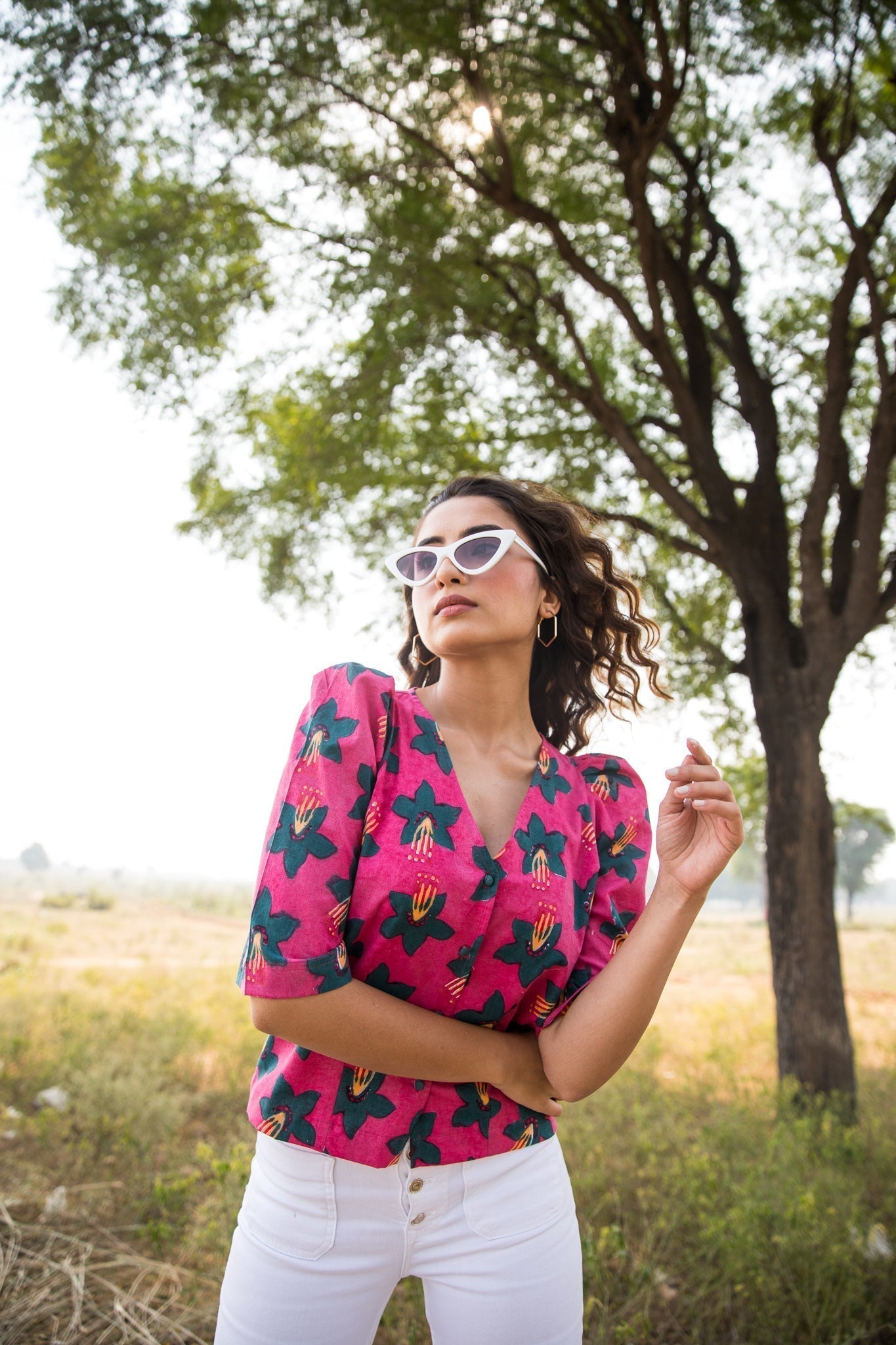 this shirt is crafted in pure cotton hand block printed in hues of pink and green featuring a V neckline, puffed sleeves, and relaxed fit