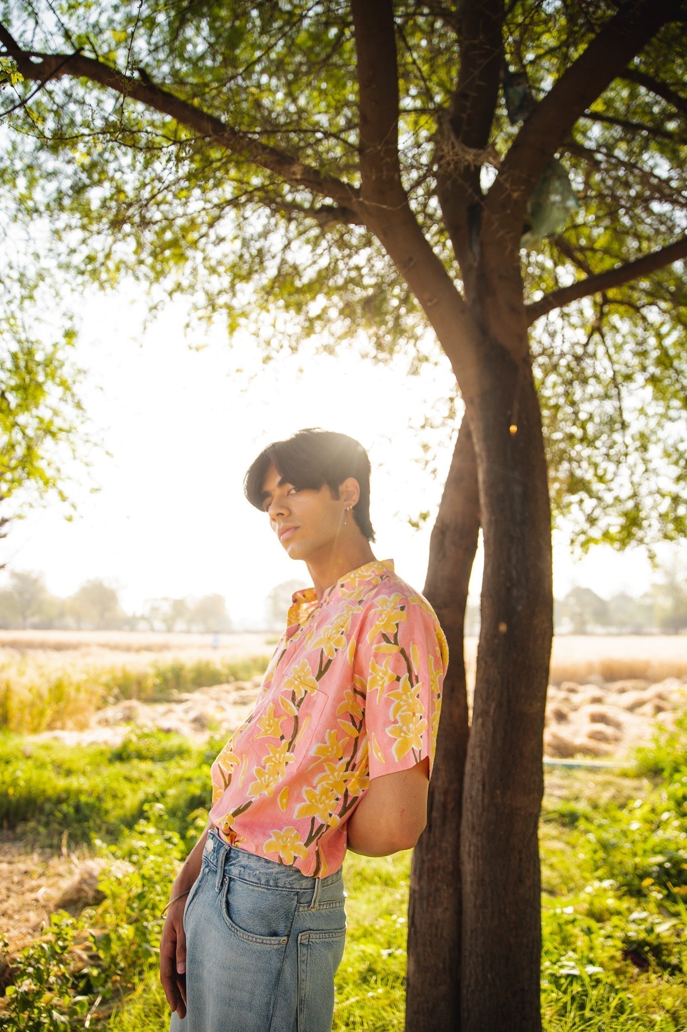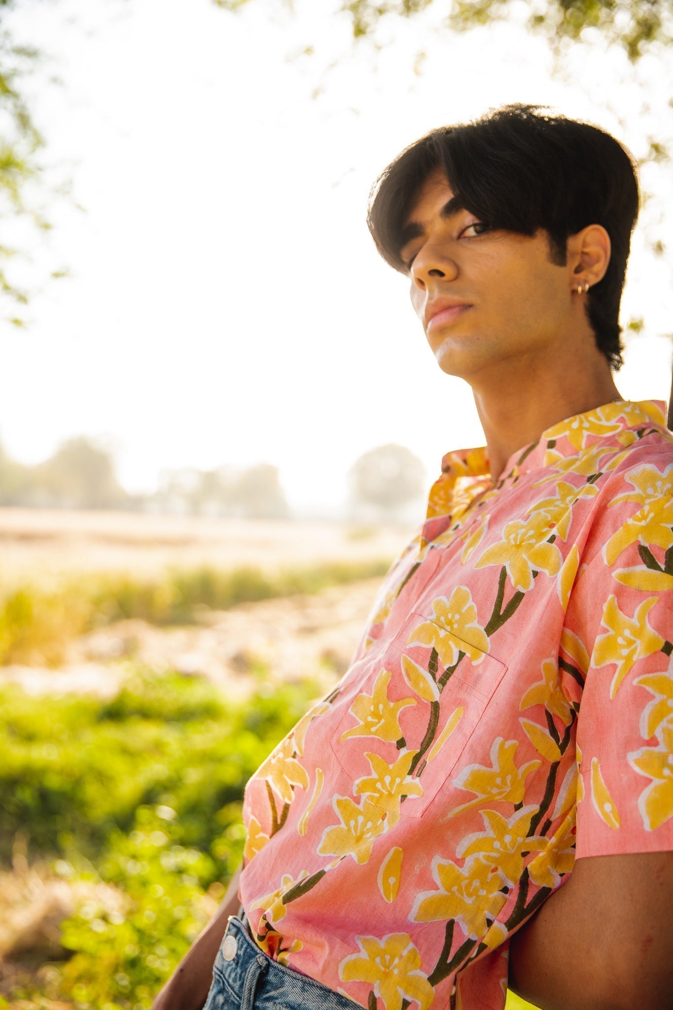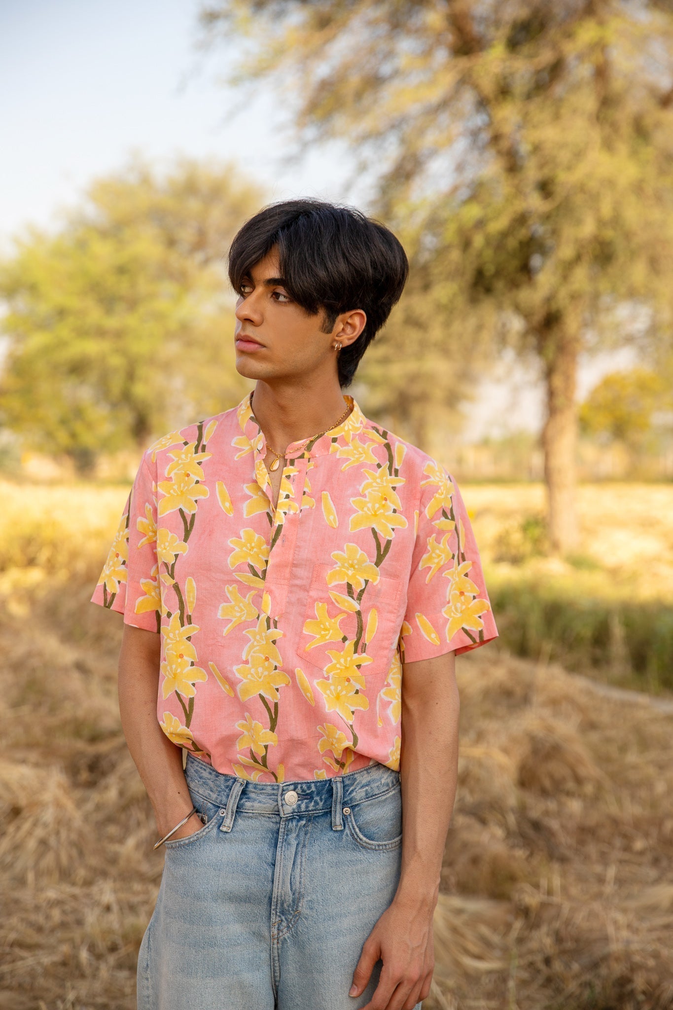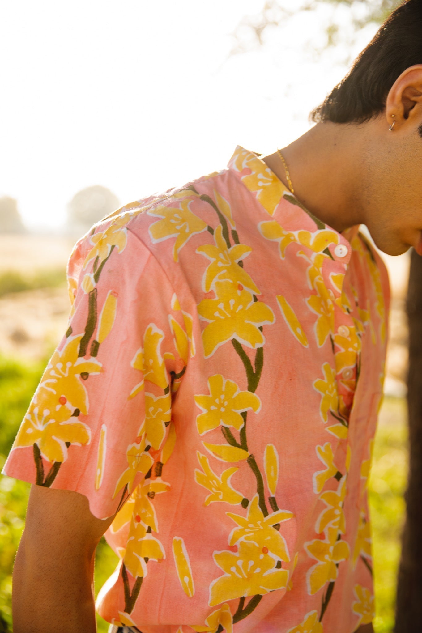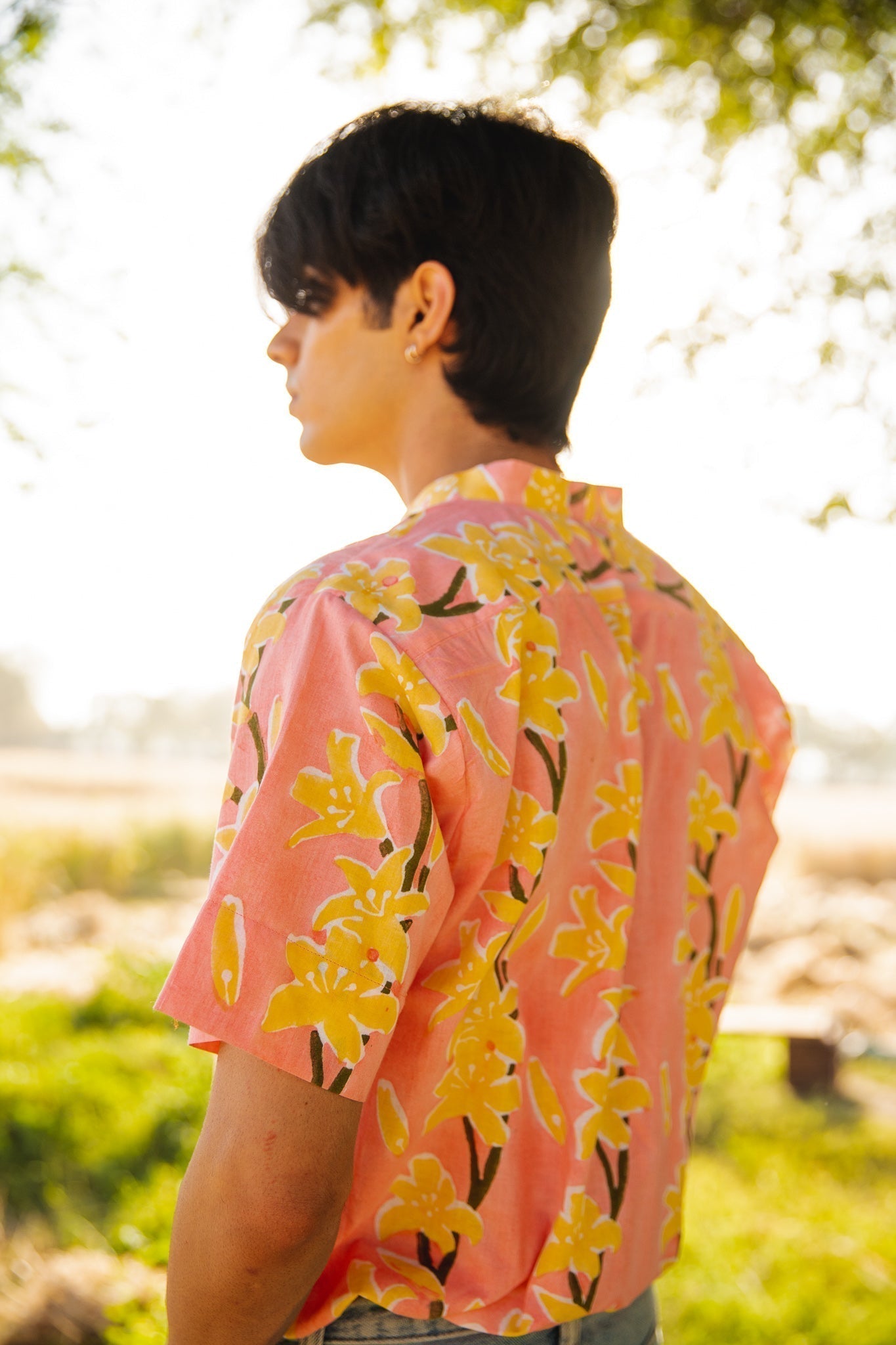 This shirt is hand-block printed in our exclusive lily print featuring hues of pink and green. A perfect go-to shirt.