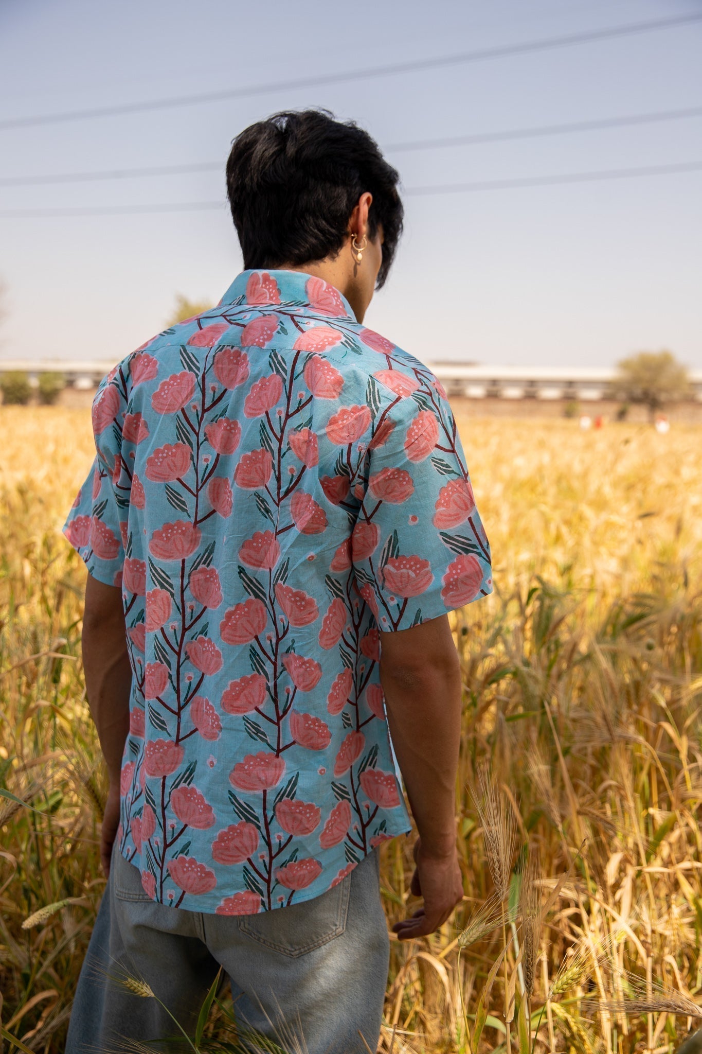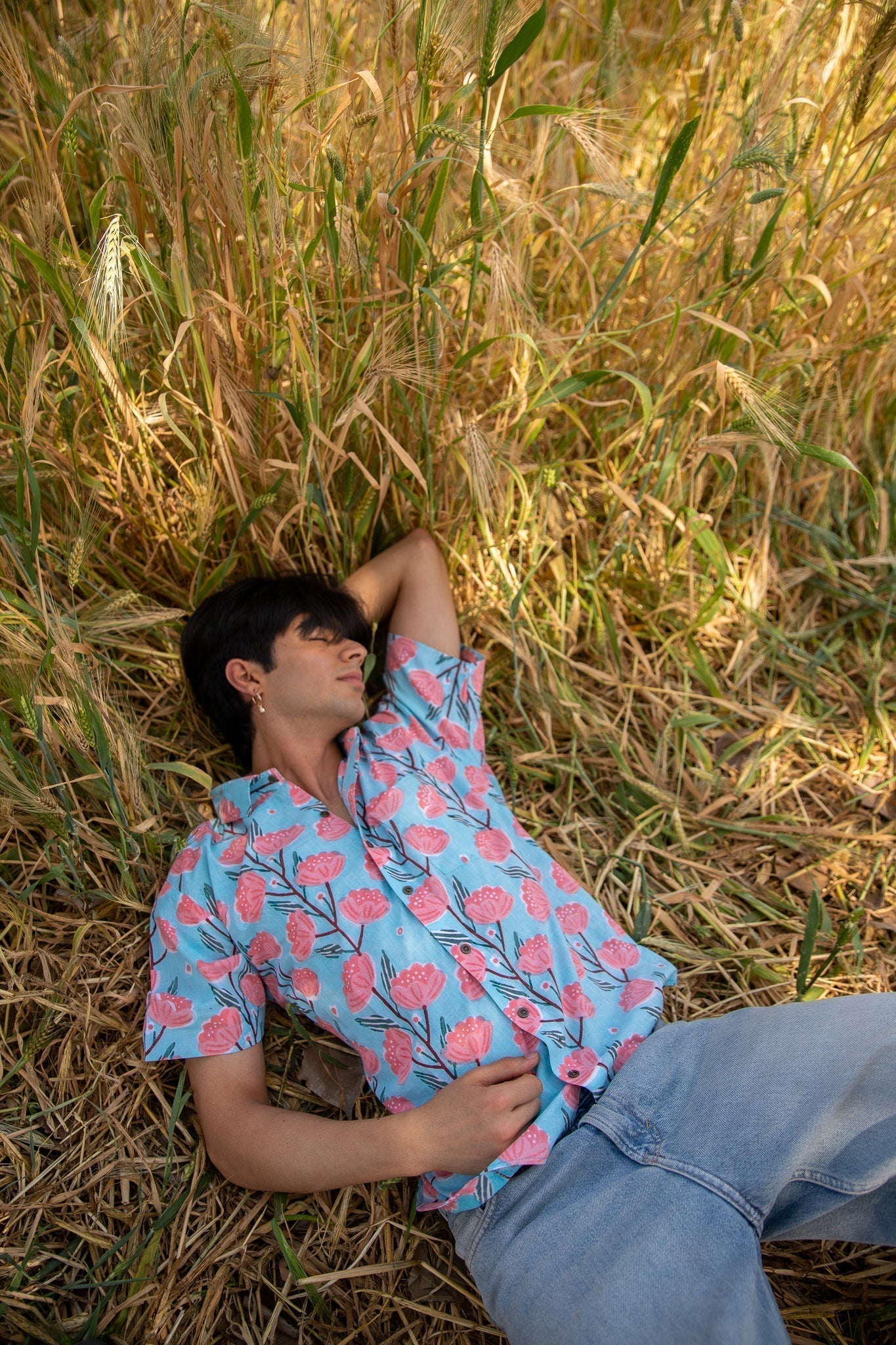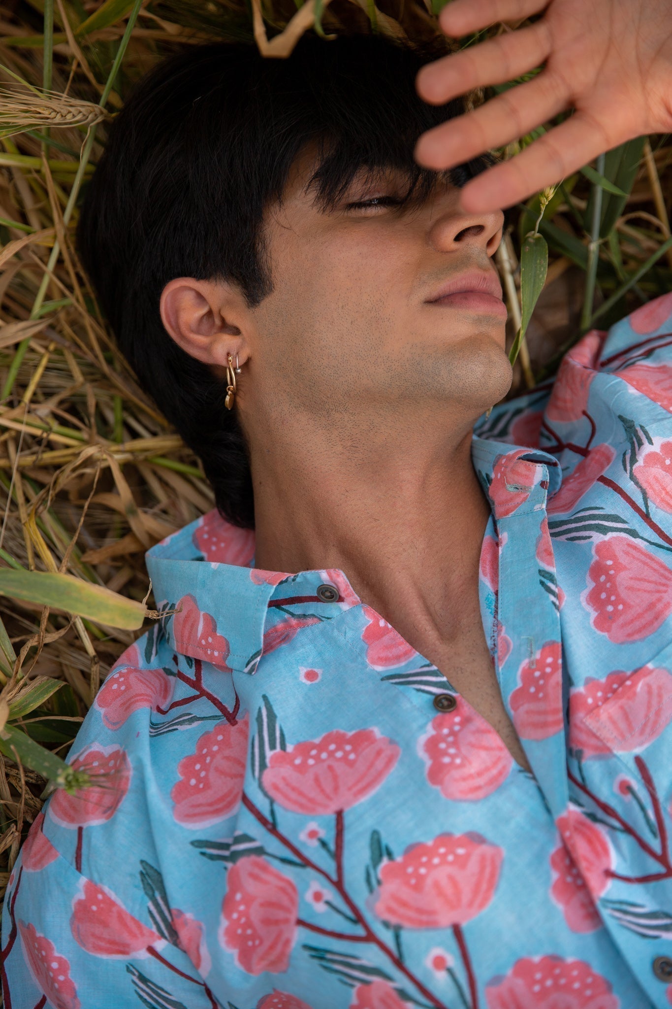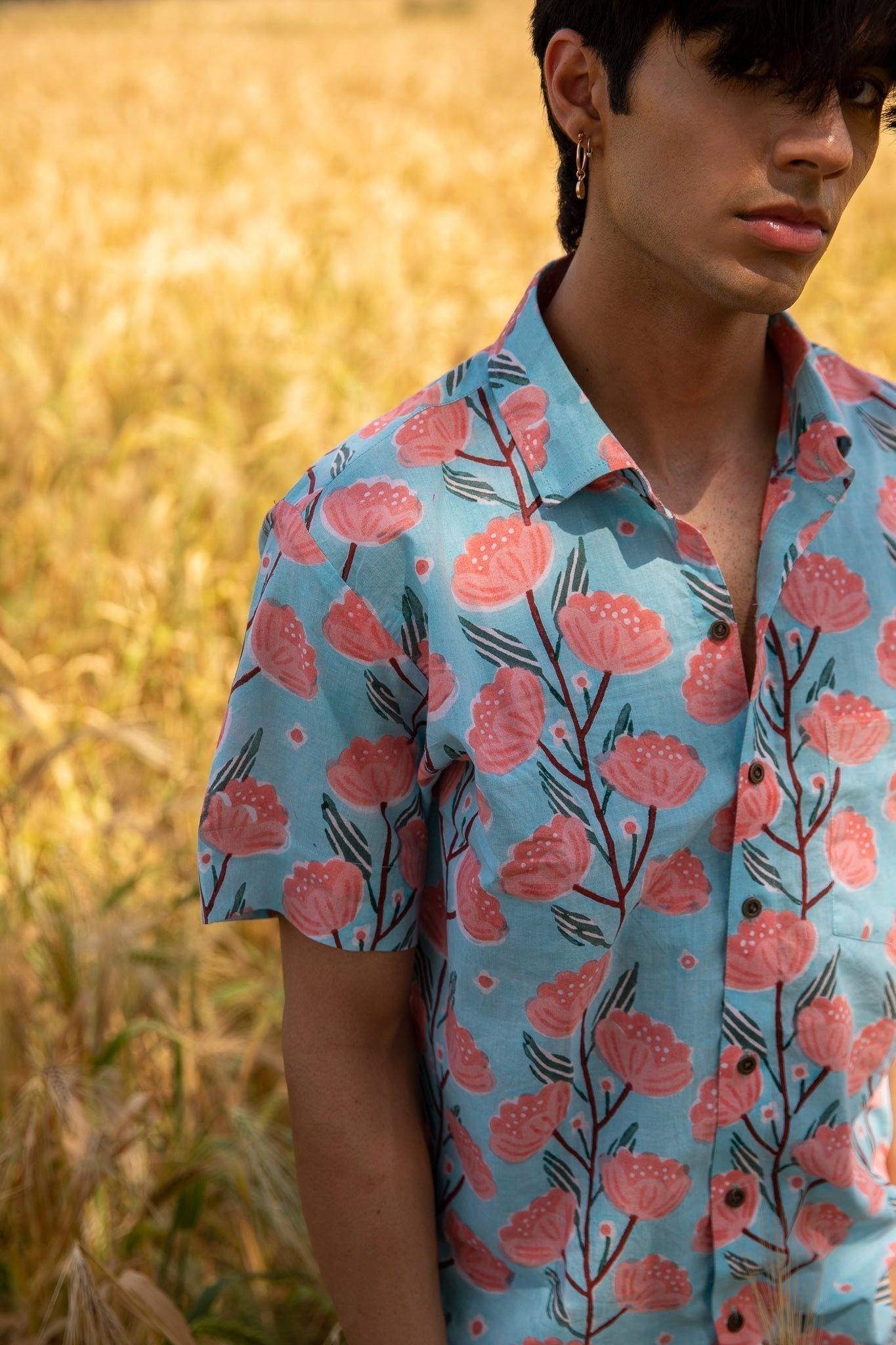 This shirt is hand-block printed in our exclusive floral print featuring the hues of Blue and pink. Pair it with cool denim and youƒ??re too good to go.