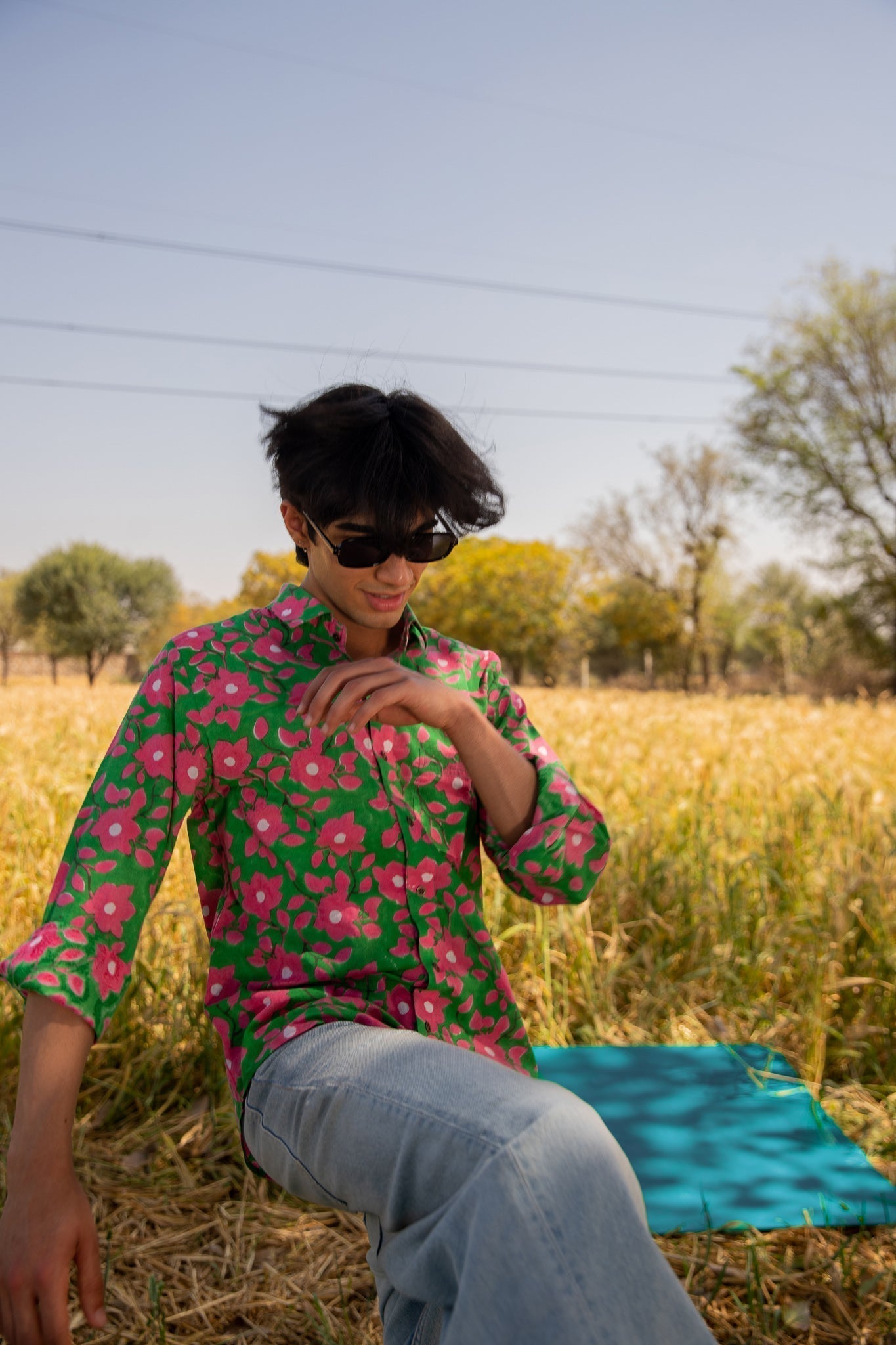 This shirt is hand block printed in our exclusive flora print featuring the season fave hue of green and pink. Wear is with cool bottoms and youƒ??re good to go.