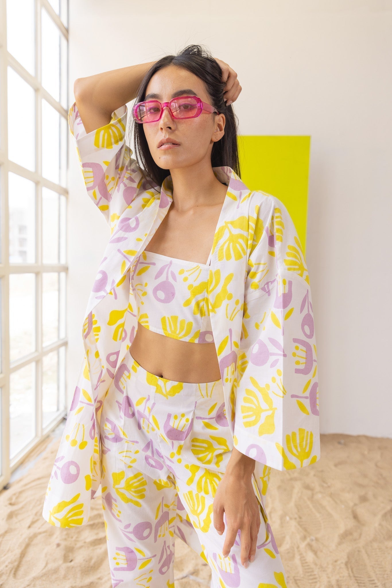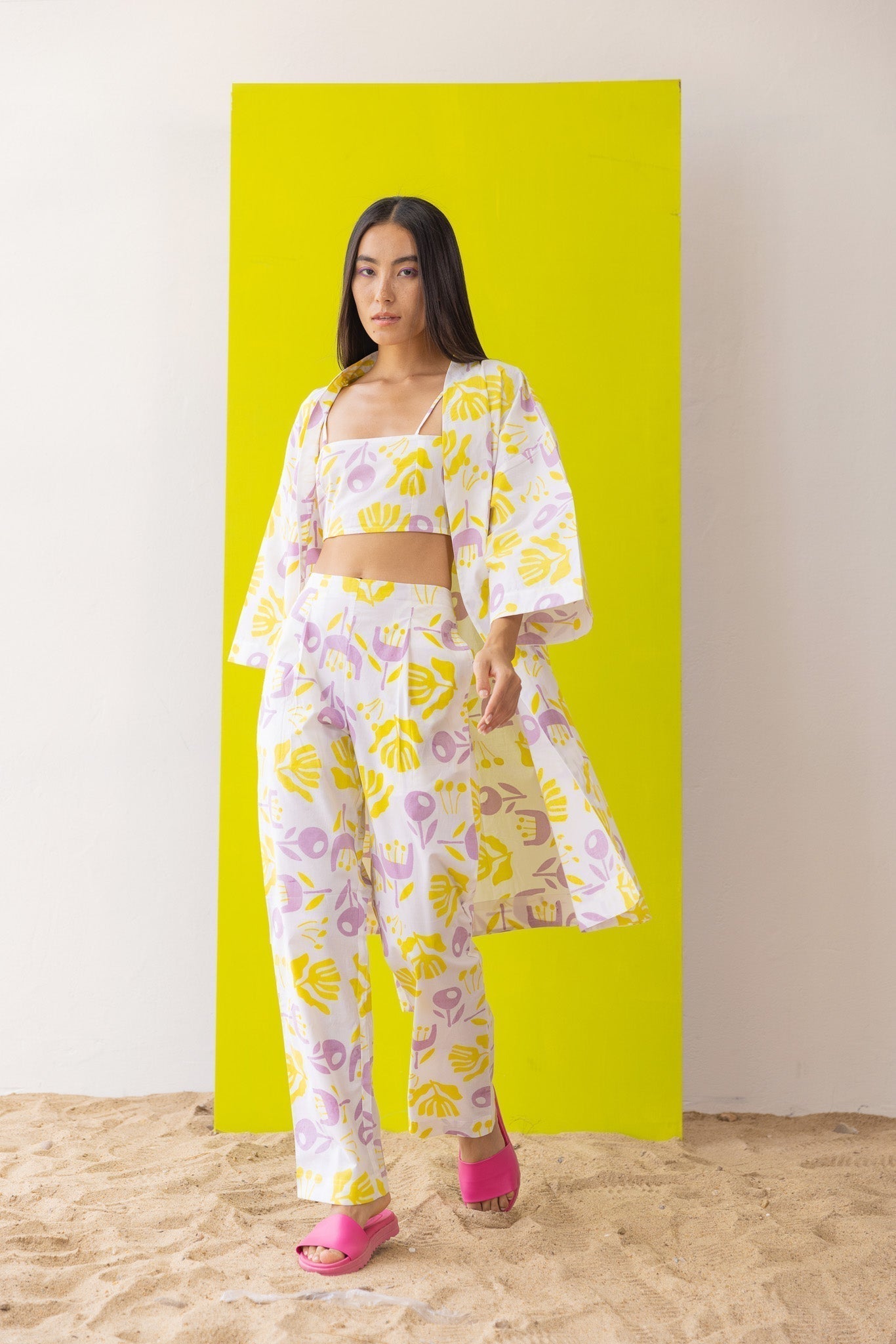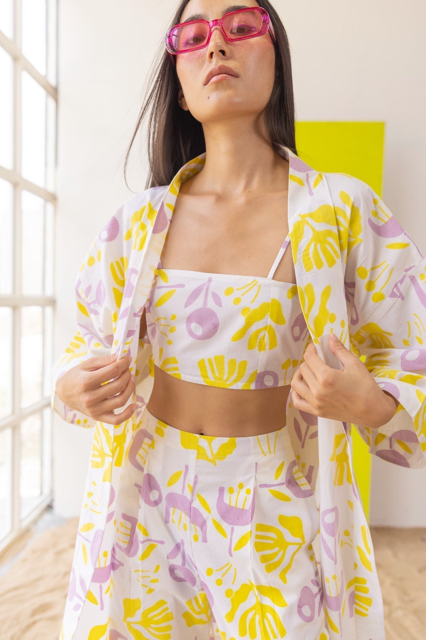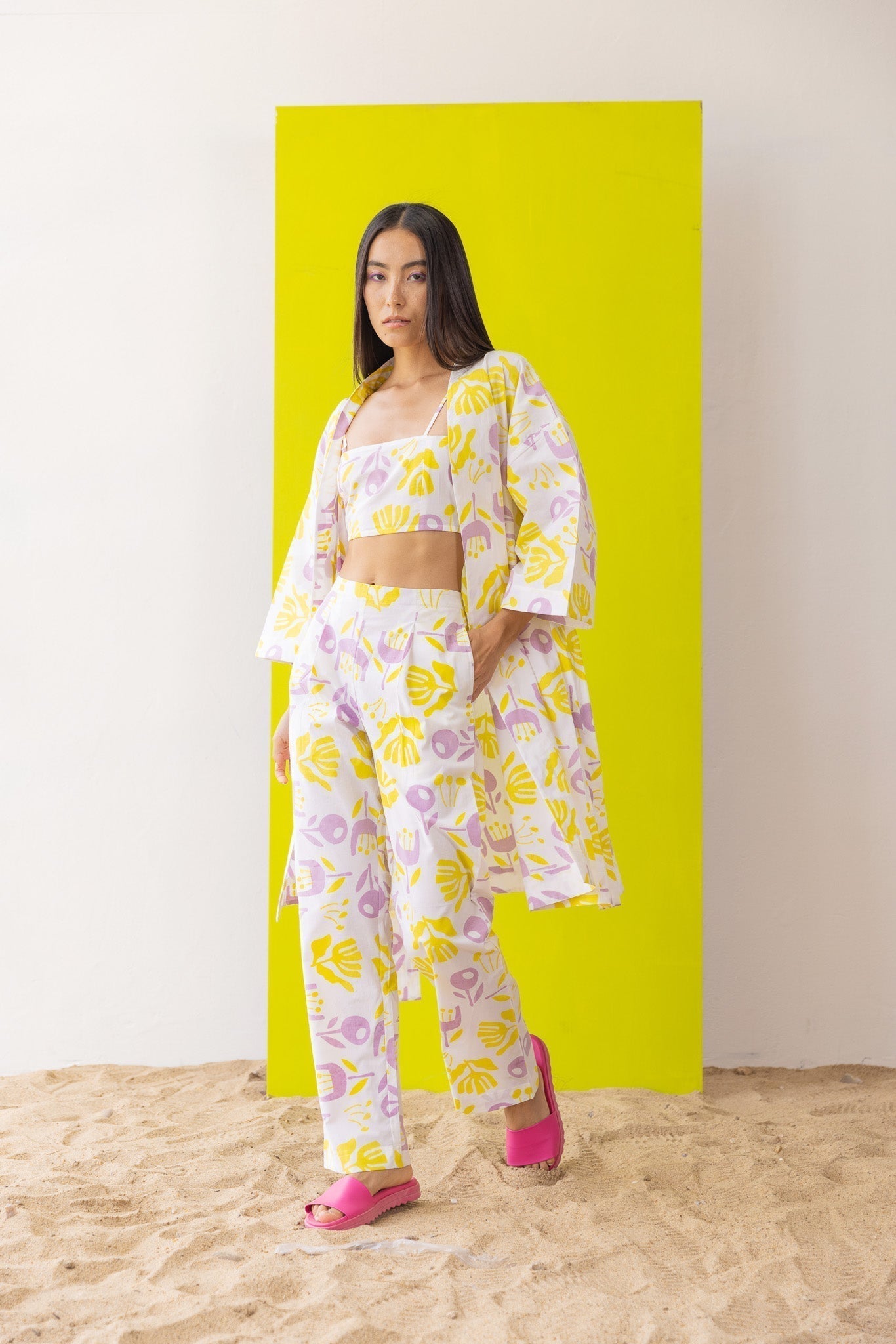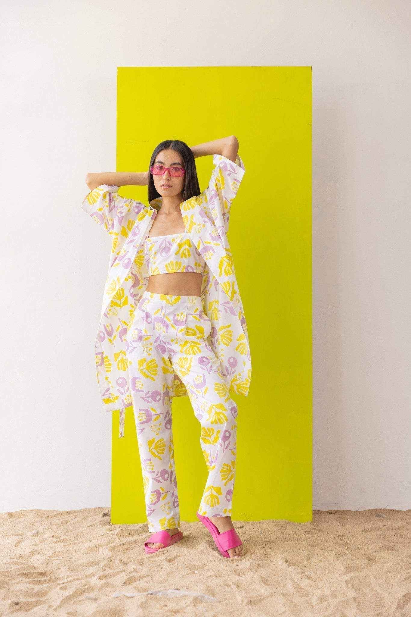 The eye grabbing co-ord set is here featuring speghetti top inside with smocking at the back, long jacket to give you the bold yet elegant style nook and trouser to complete the look in our exclusive new print.?ÿ