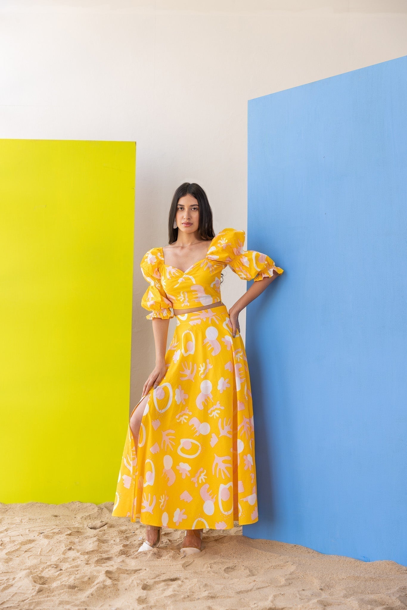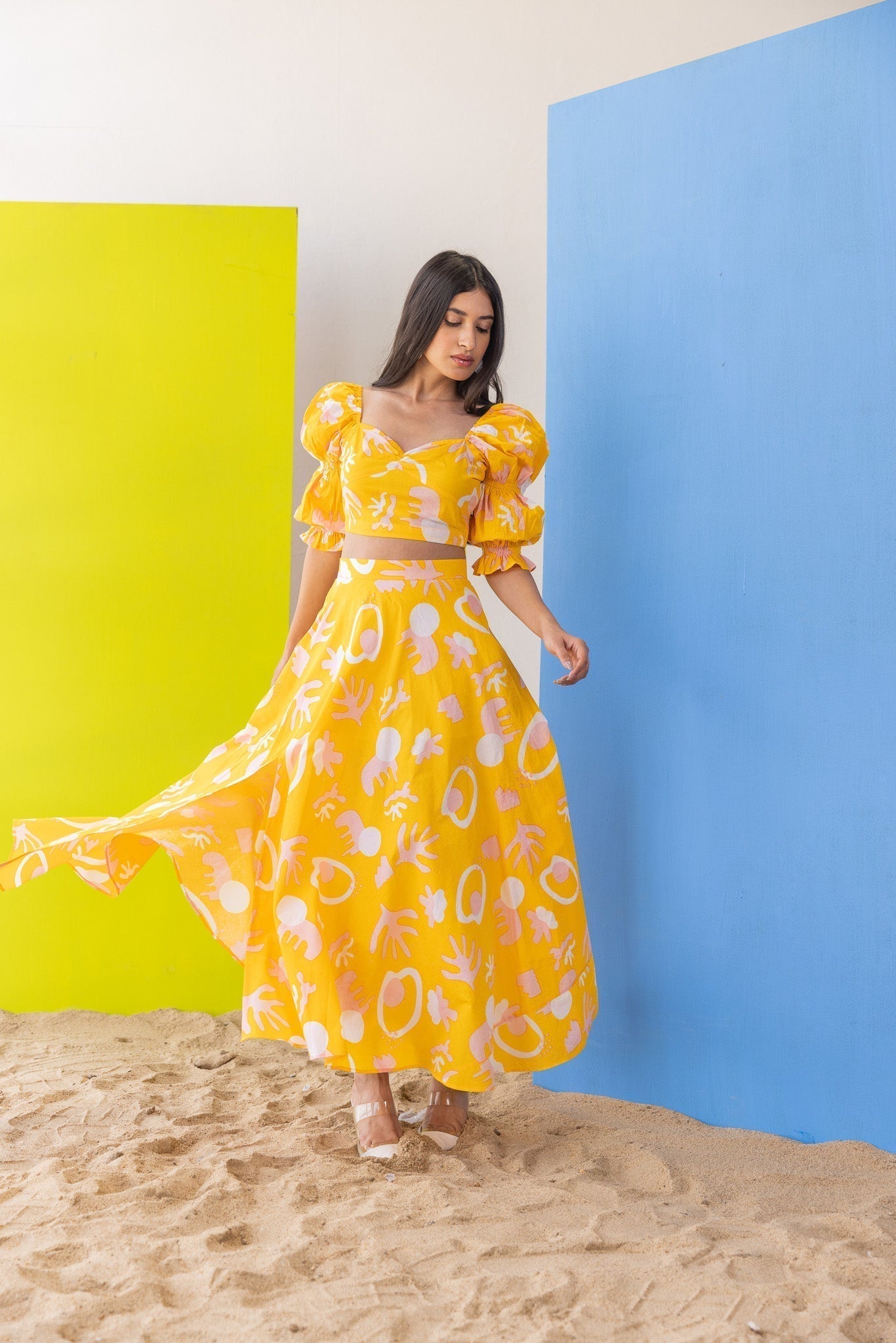 A tropical statement of what making a bold impression means to you. The Summer Sunrise Co-ord Set is here in the most fancy-yet-cool silhouette! It features a sweetheart neckline with a lil smocked detailing and smocked sleeves to level up whatever look (and plans!) you have in mind. The top matches your fresh?ÿskirt?ÿ- a total must-have buddy!?ÿIt features a flowy fit to follow your bold moves with the side slit and this awe-inspiring color for that lovely touch youƒ??re falling for to match all your tops and layers.?ÿ