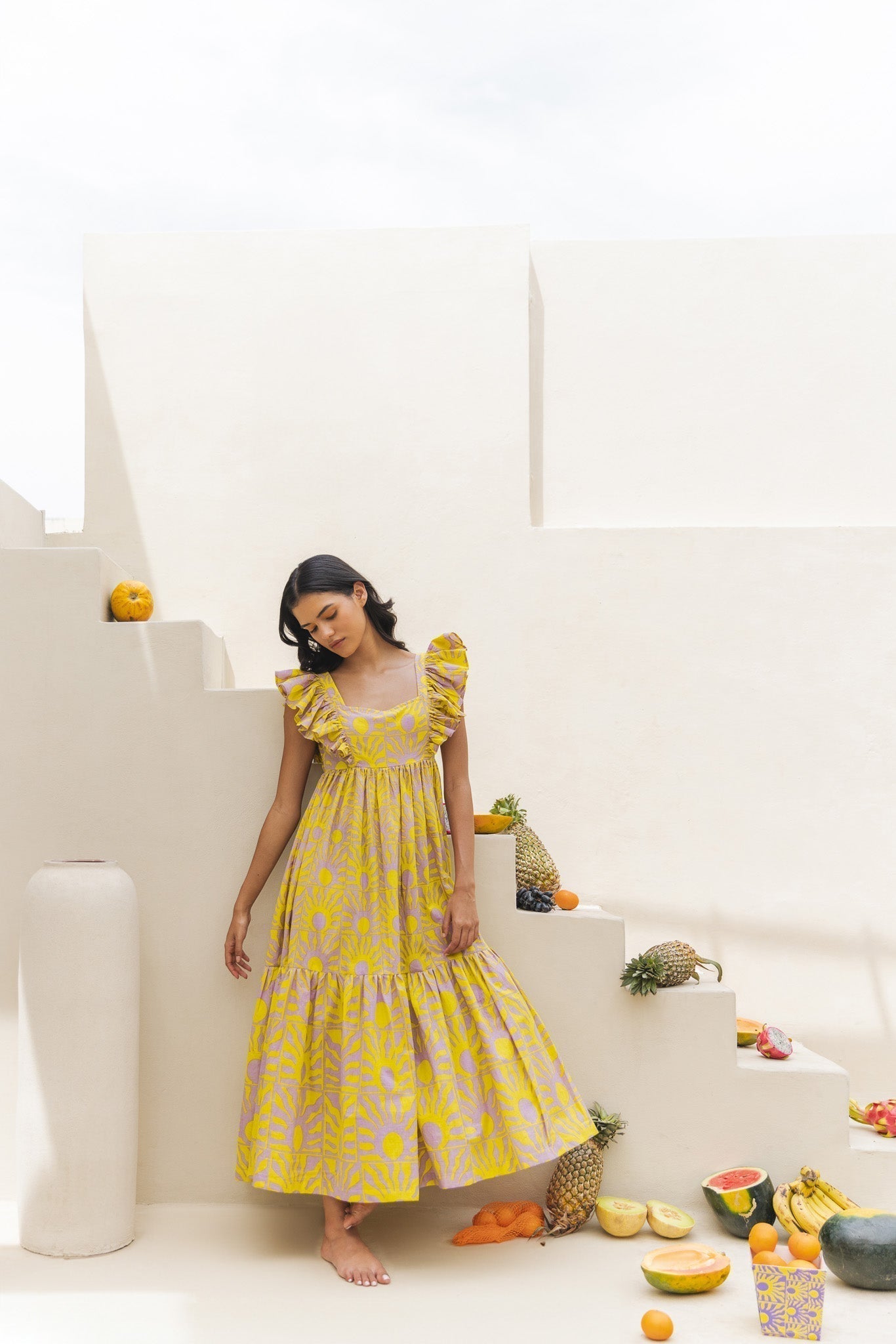 Stop the scroll and pack your bags because the ultimate vacay dress has arrived! Say hello to your picture-perfect vacation companion. With our exclusive sun-inspired print, midi length, and shoulders adorned with playful frills, this dress is an instant mood lifter. The flare? To die for! And let's not forget the square neckline, adding a touch of chic to your getaway look. It's not just a dress; it's a dream come true for every wanderlust soul.